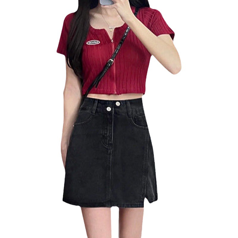 夏季温柔系穿搭女新款辣妹纯欲风红色短款上衣半身裙两件套装