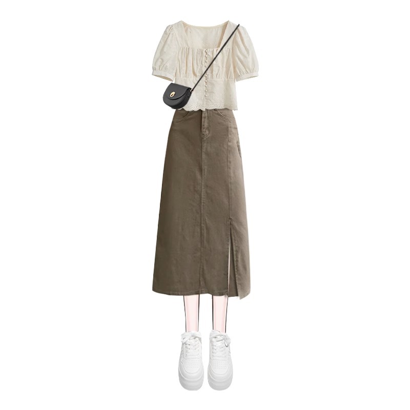 夏季轻熟风穿搭女新款法式泡泡袖衬衫上衣牛仔半身裙两件套装
