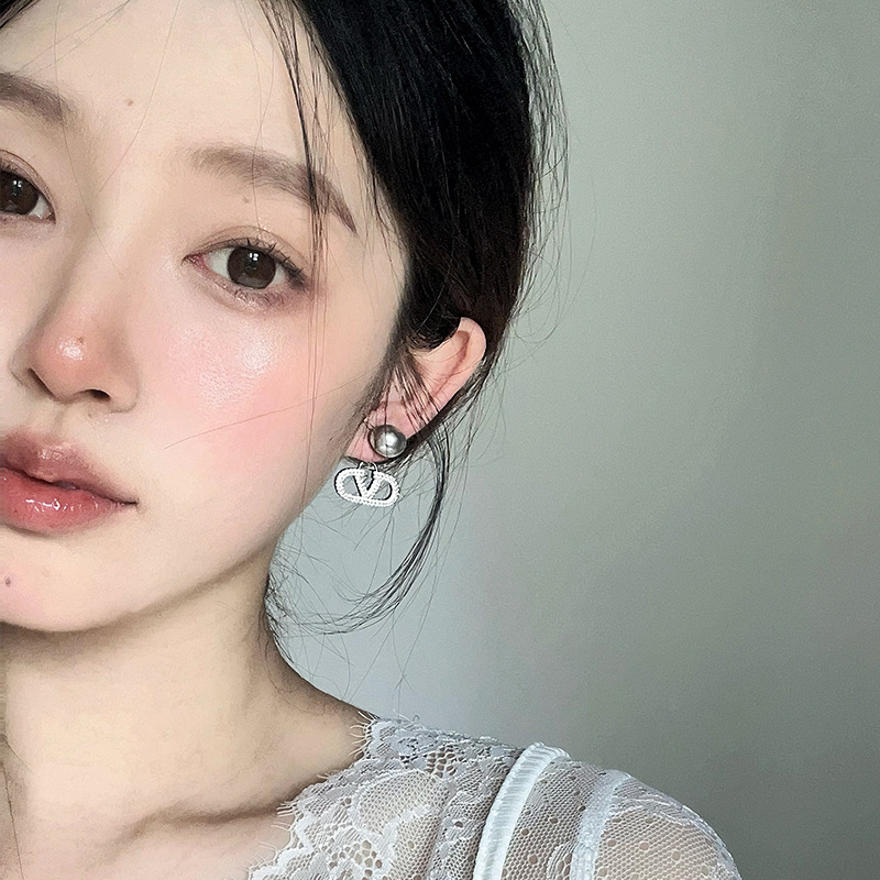 法式气质灰色珍珠满钻字母v耳环 轻奢高级感精致前后两戴耳钉耳饰