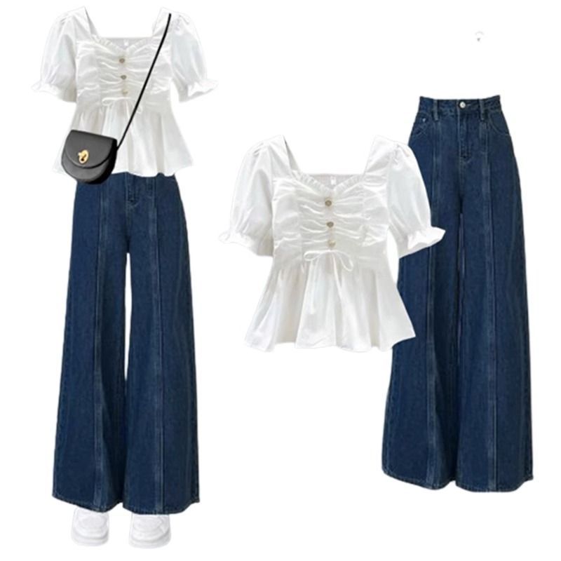 夏季穿搭女新款遮肉显瘦方领泡泡袖衬衫牛仔裤两件套装