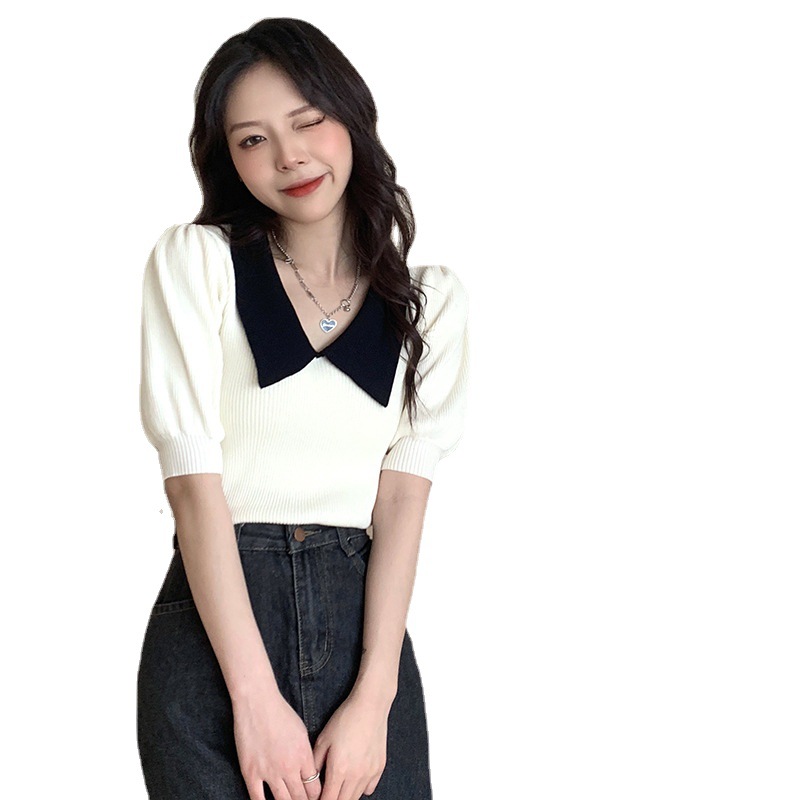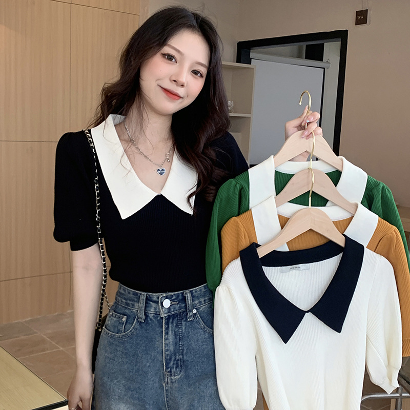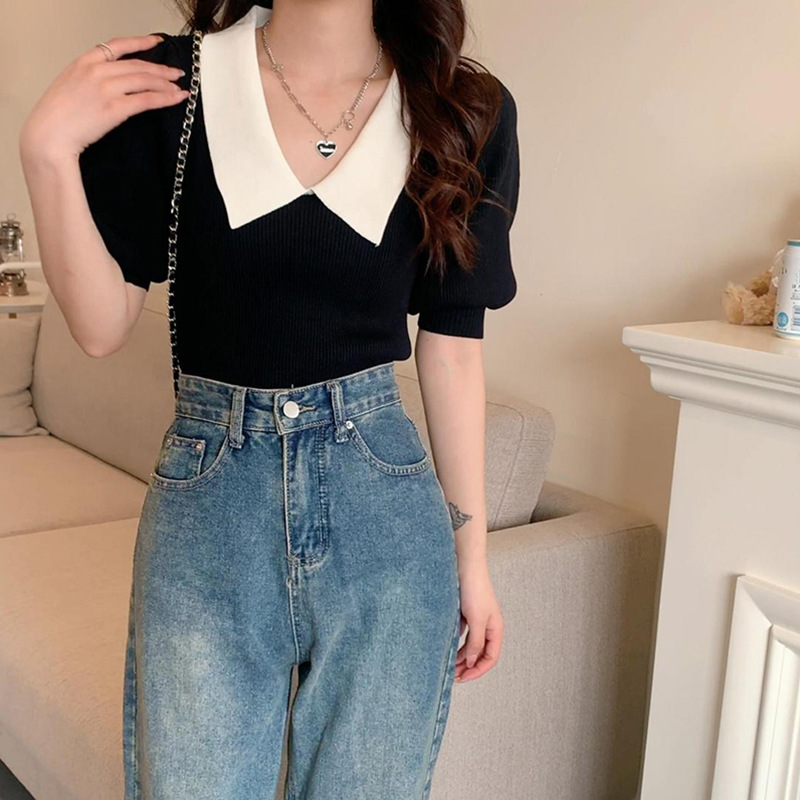 法式高级感撞色polo领短袖上衣女夏季韩版新款洋气减龄冰丝针织衫
