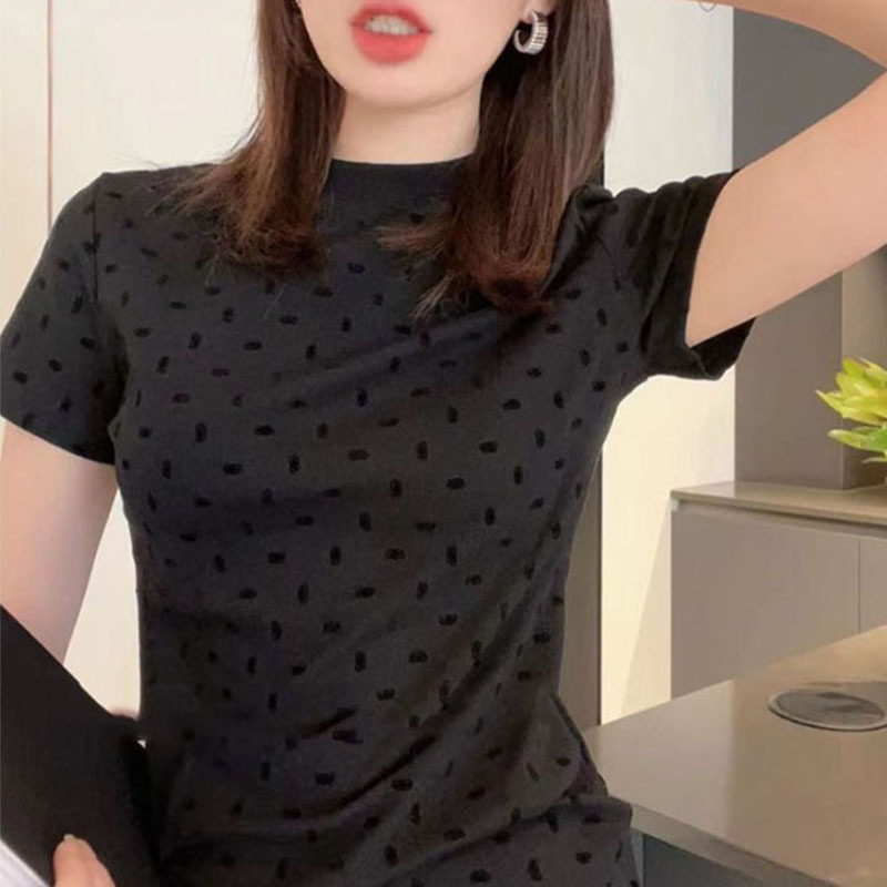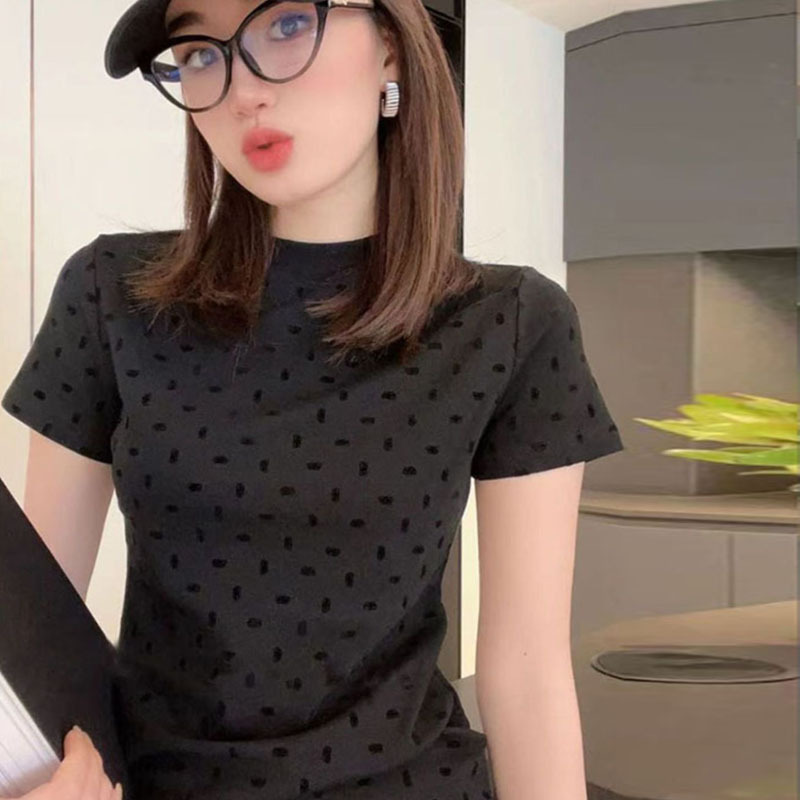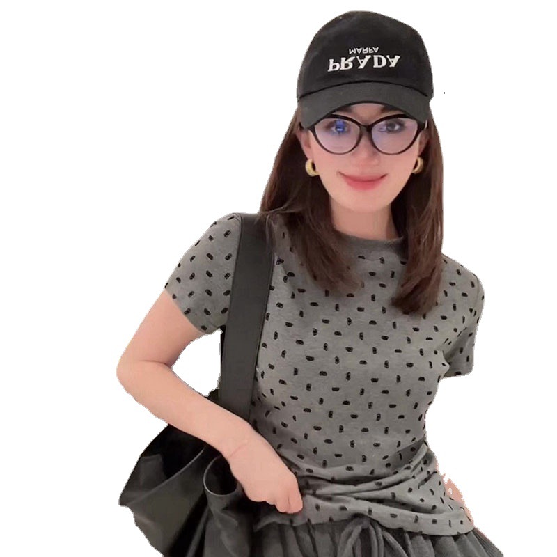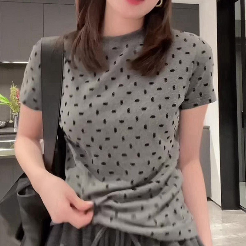 夏季新款圆领修身显瘦减龄高级感气质灰色波点短袖t恤女
