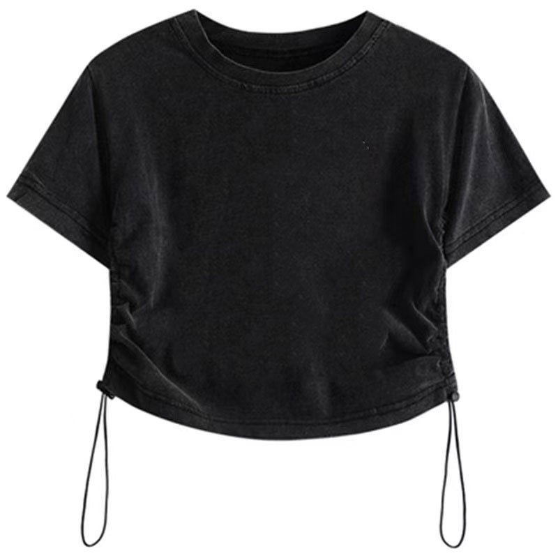 水洗纯棉复古做旧短袖t恤女学生夏季新款欧货爆款矮个抽绳设计感