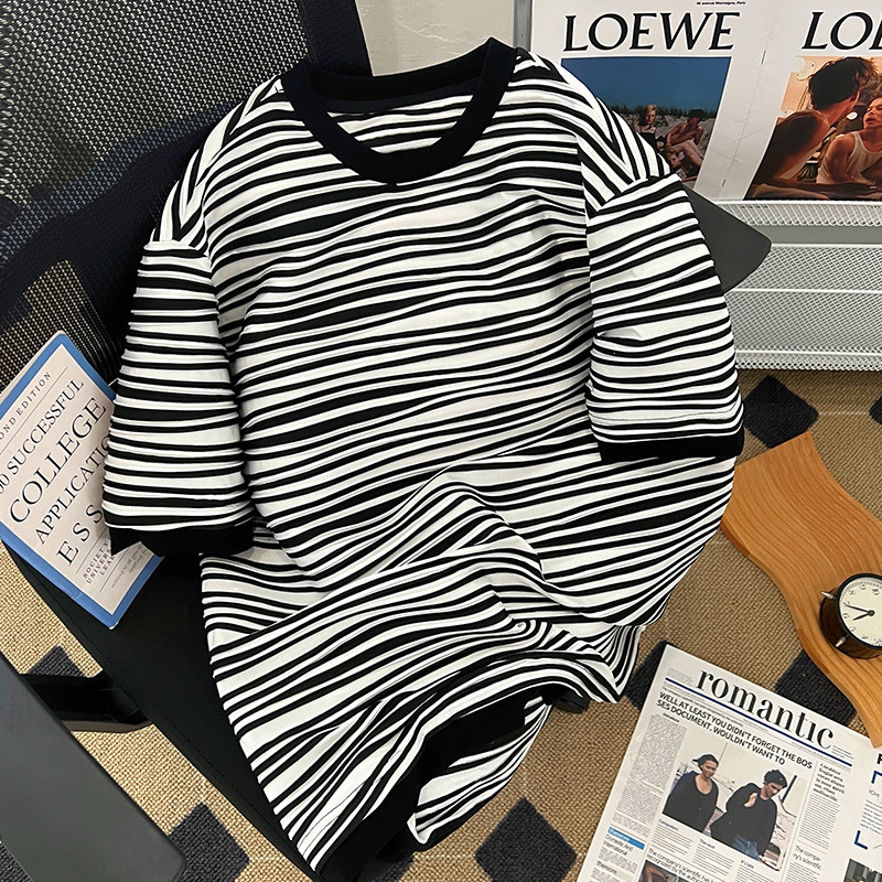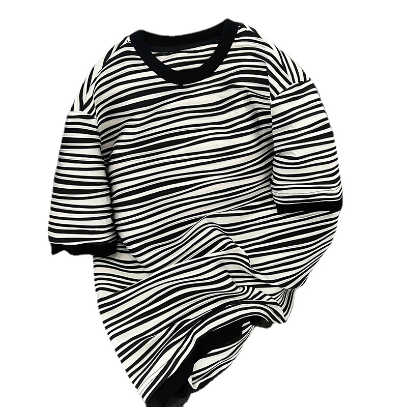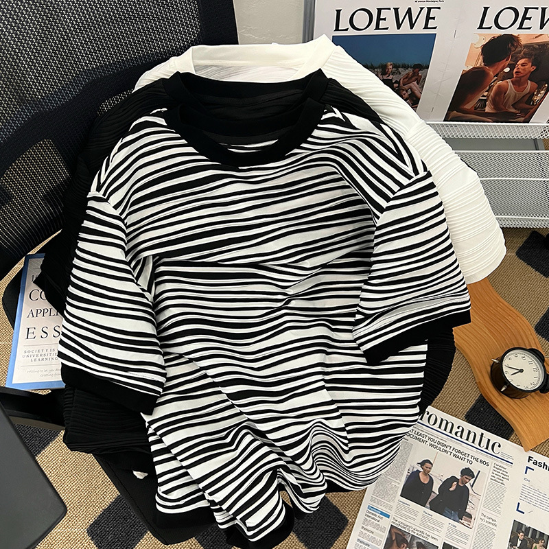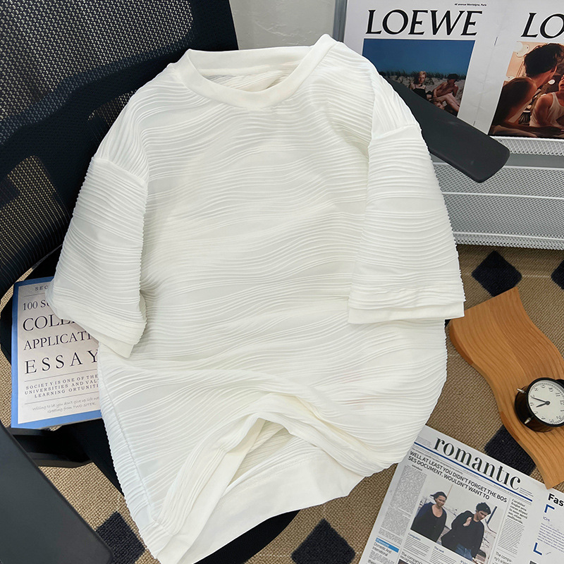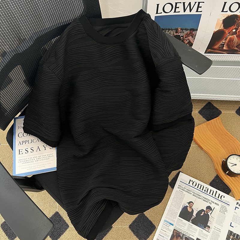 韩版新款高级感肌理纹拼接短袖T恤女港风chic宽松正肩半袖上衣夏