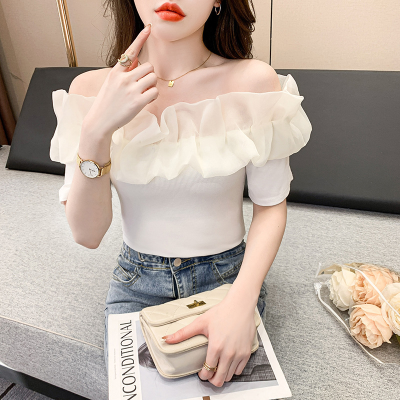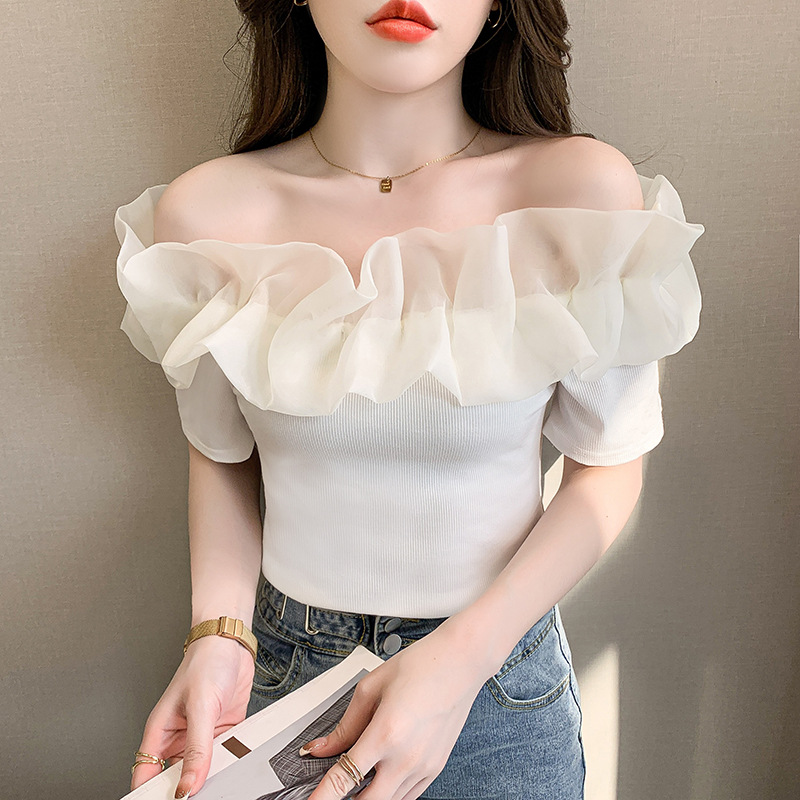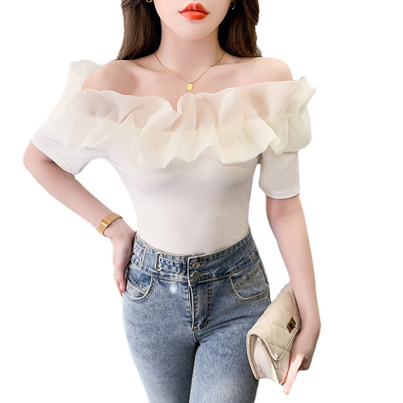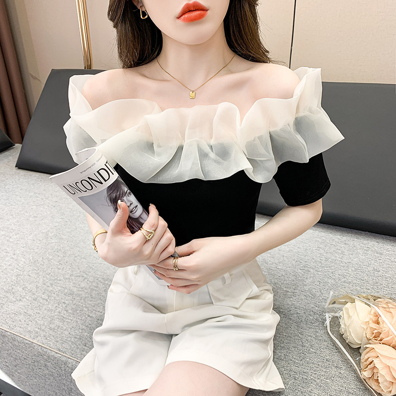 短袖女夏季新款高级感T恤网纱拼接设计感小众性感一字肩上衣