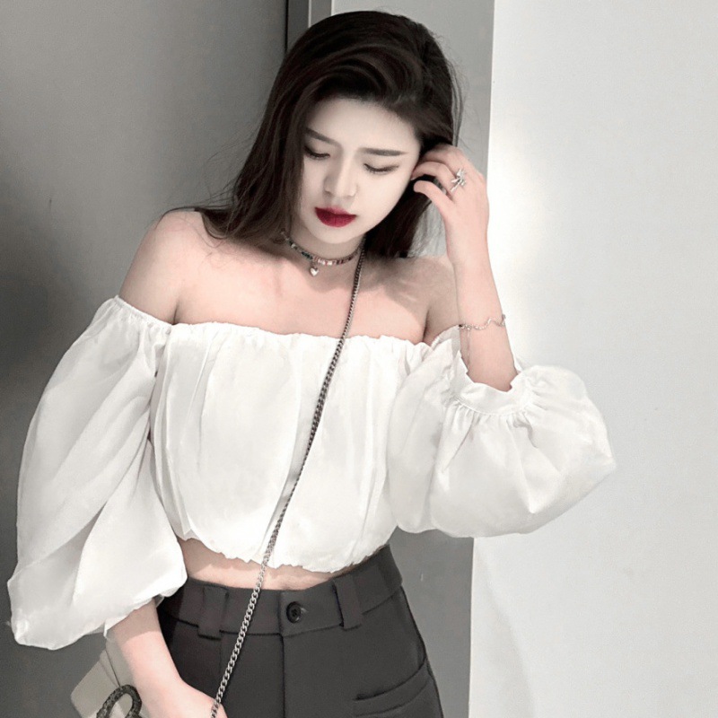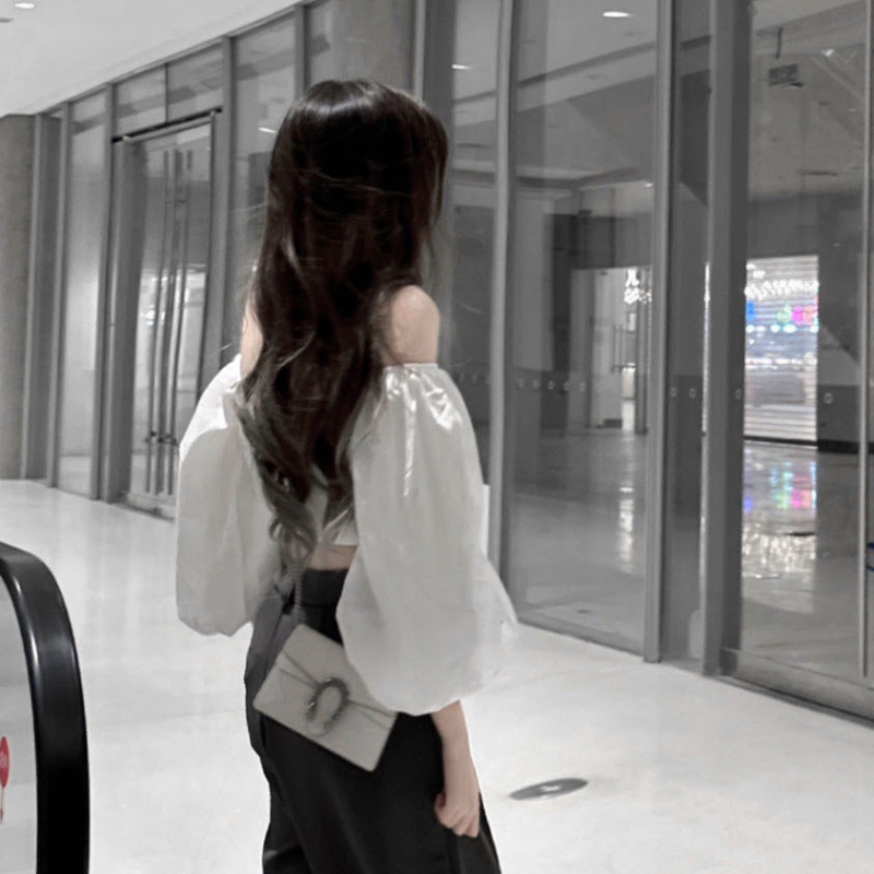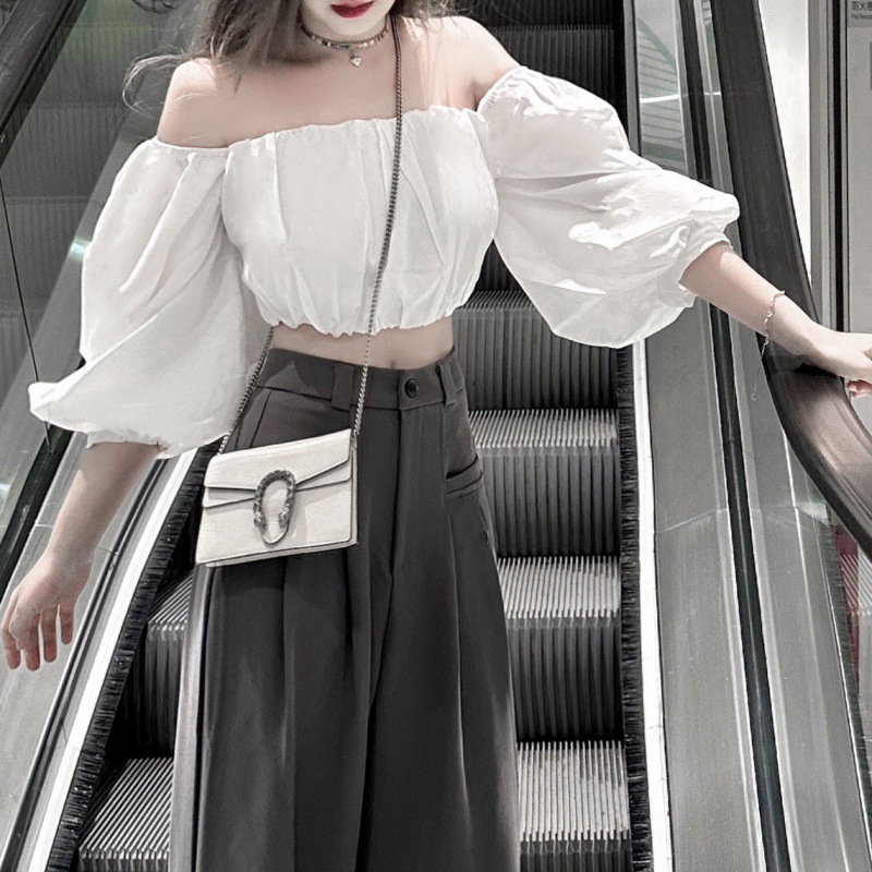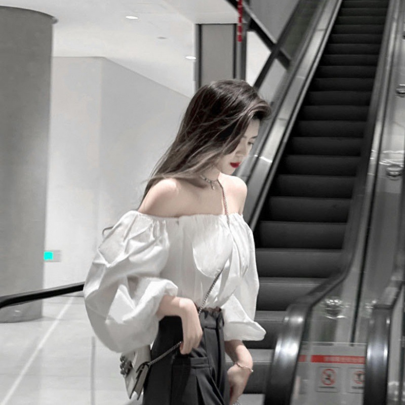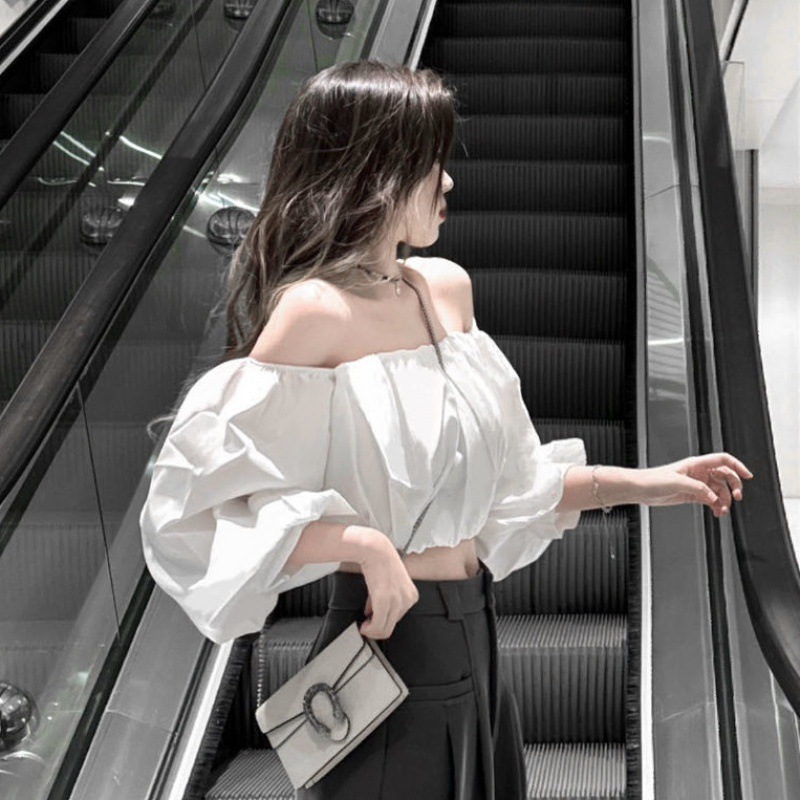 一字肩泡泡袖露肩鱼骨短款T恤女夏季高级感chic辣妹短款上衣服ins