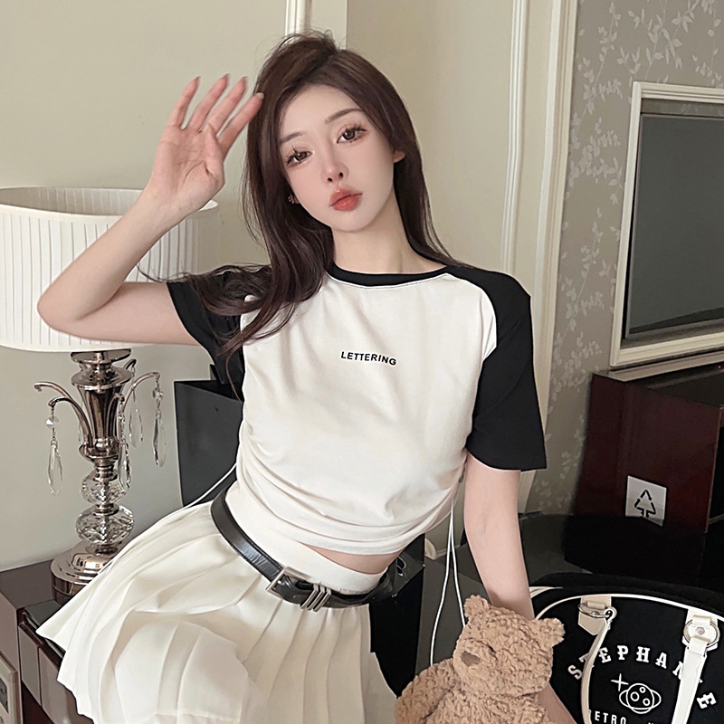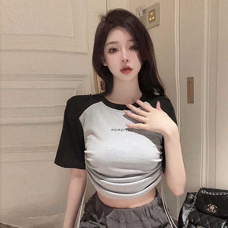 设计感抽绳撞色圆领辣妹上衣夏个性女装新款打底修身短款短袖T恤