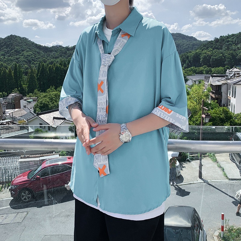 痞帅七分袖衬衣男士夏季宽松冰丝短袖衬衫潮流ins设计感小众上衣T