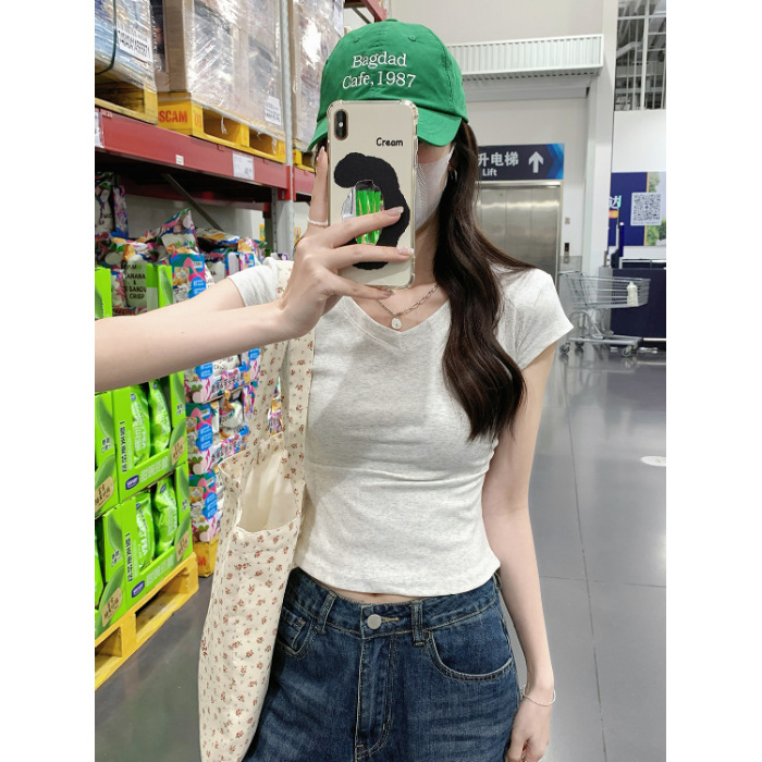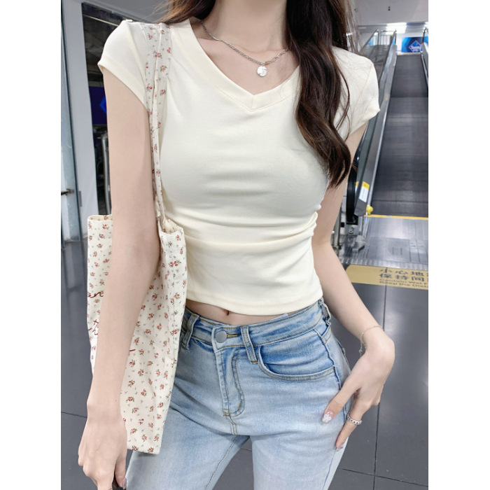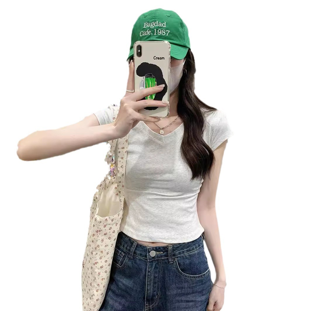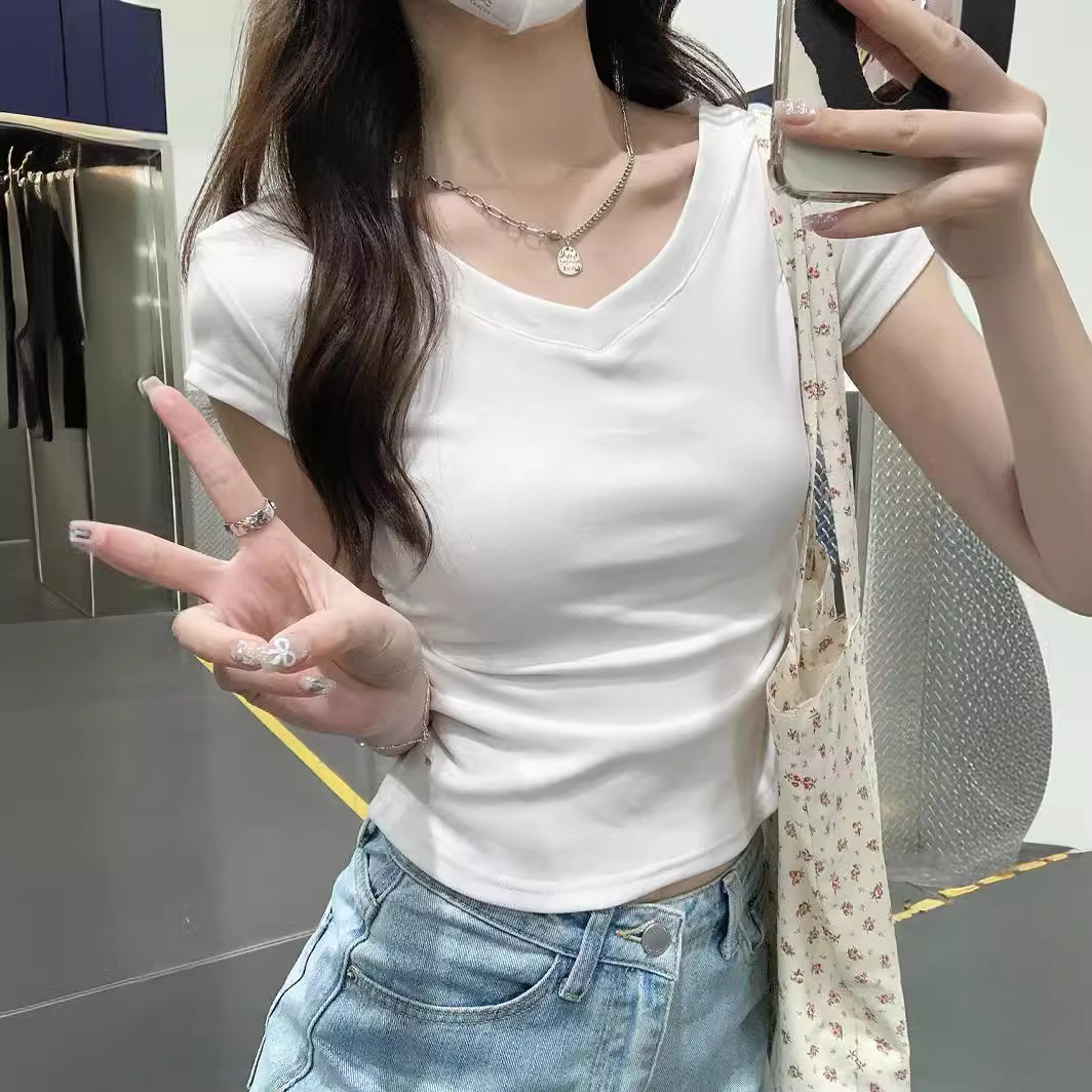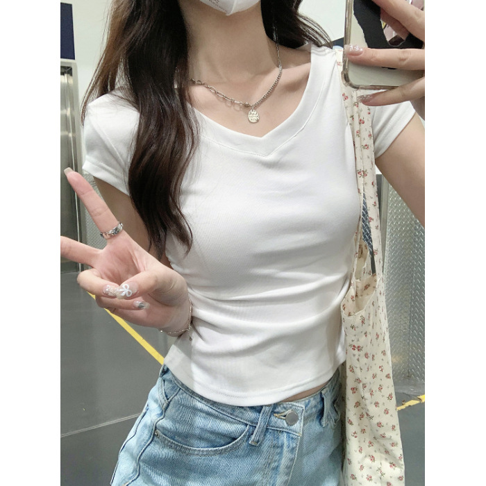 纯欲风新款正肩设计感小众短款弧形显瘦纯色T恤女圆领短袖上衣潮
