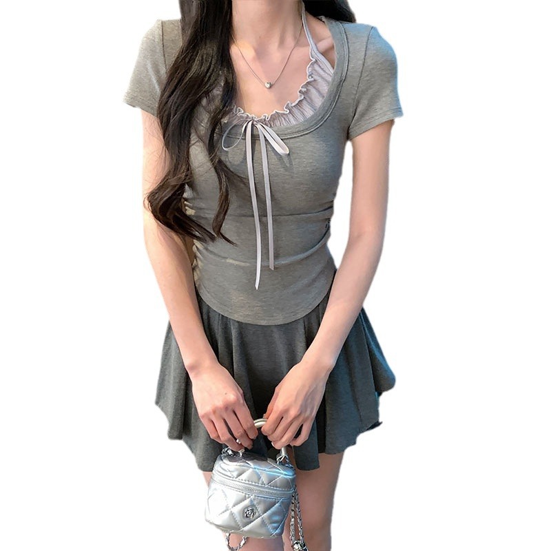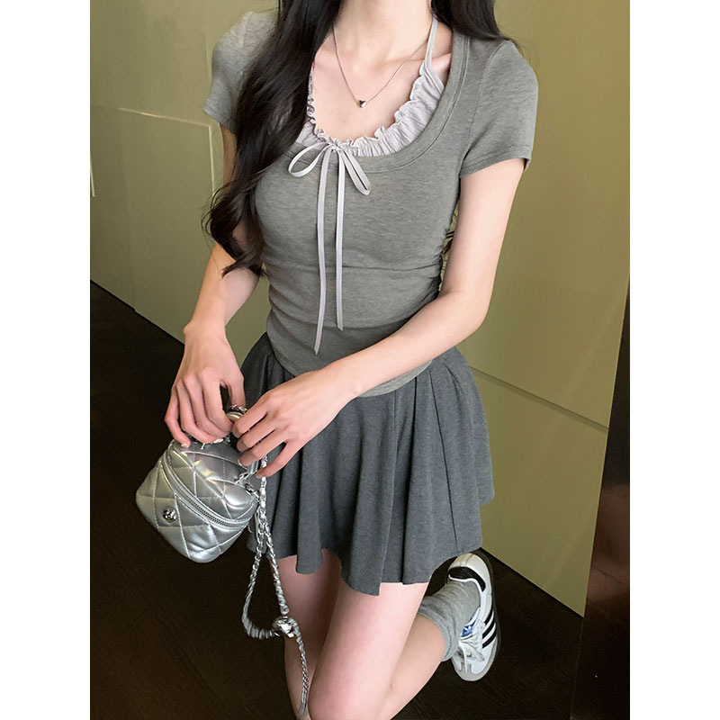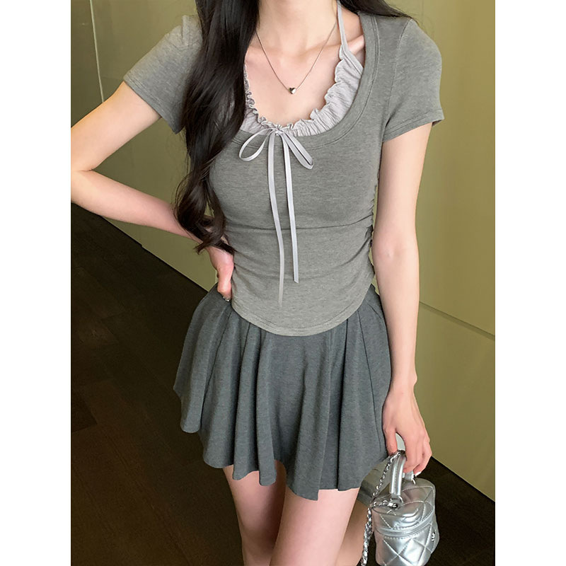 法式纯欲挂脖假两件拼接短袖T恤女夏设计感修身短袖褶皱辣妹上衣