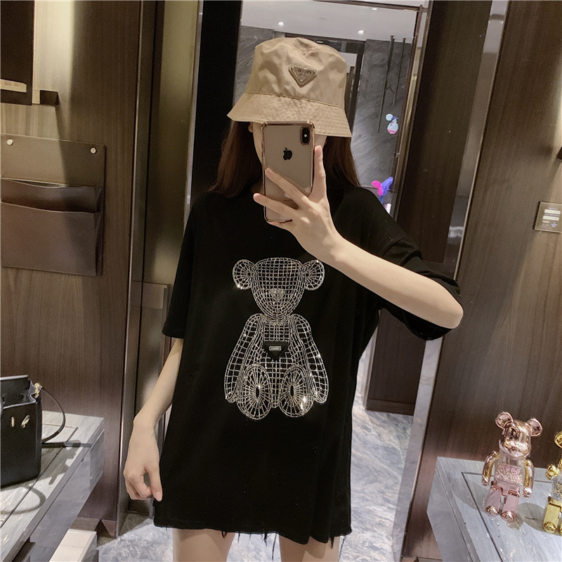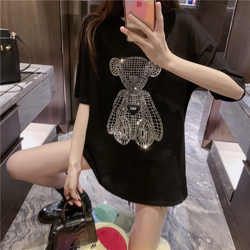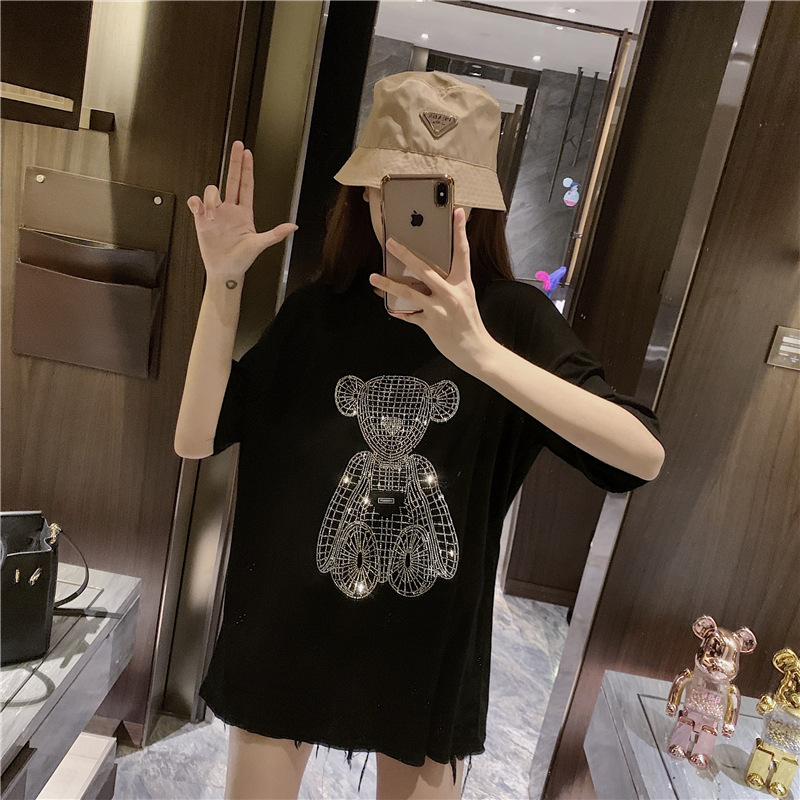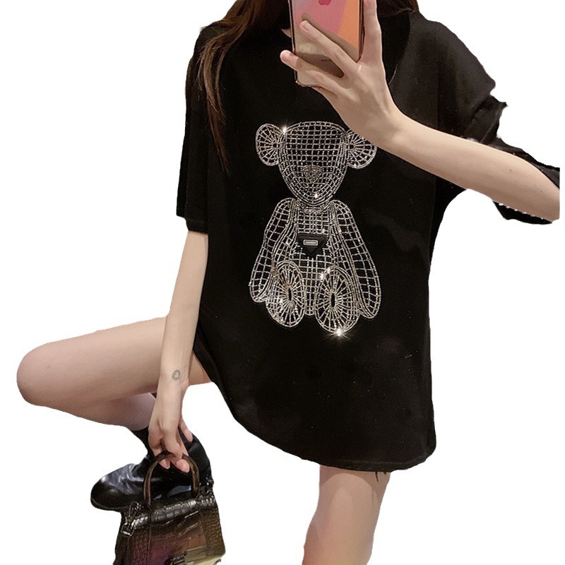 欧洲站潮牌高级感黑色短袖T恤女重工烫钻小熊精梳棉宽松体恤