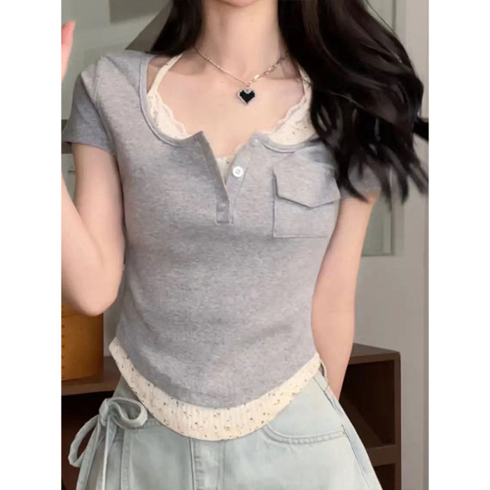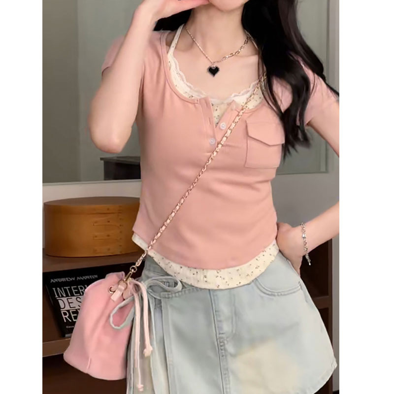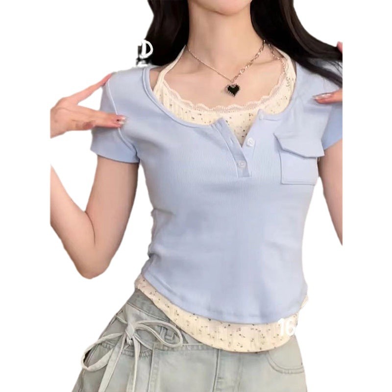 法式甜美芭蕾风短袖T恤女夏新款辣妹纯欲洋气正肩假两件上衣
