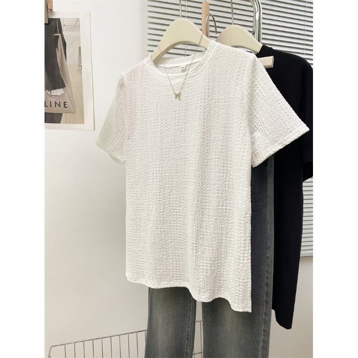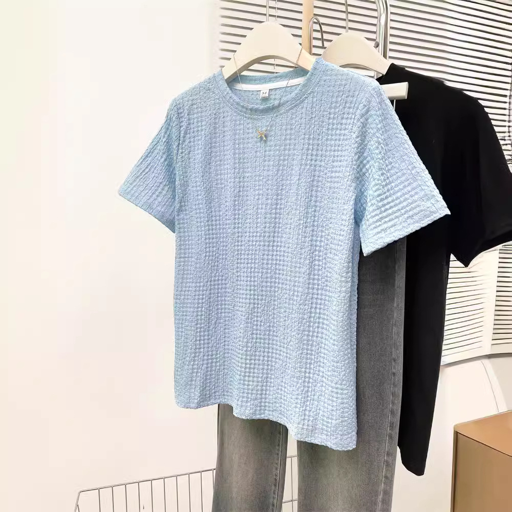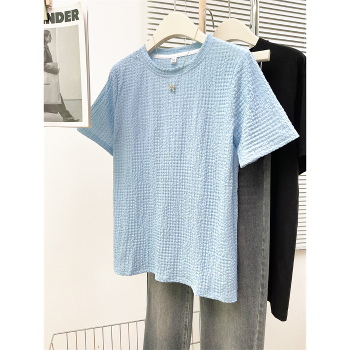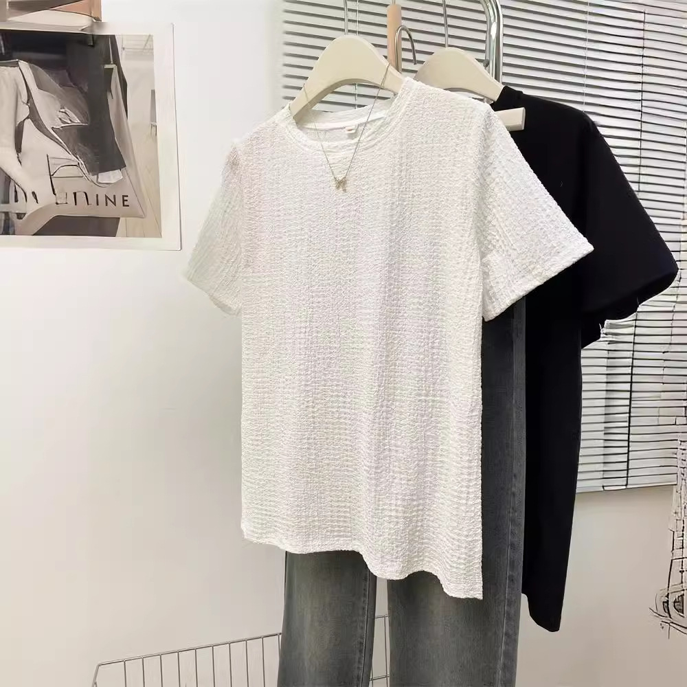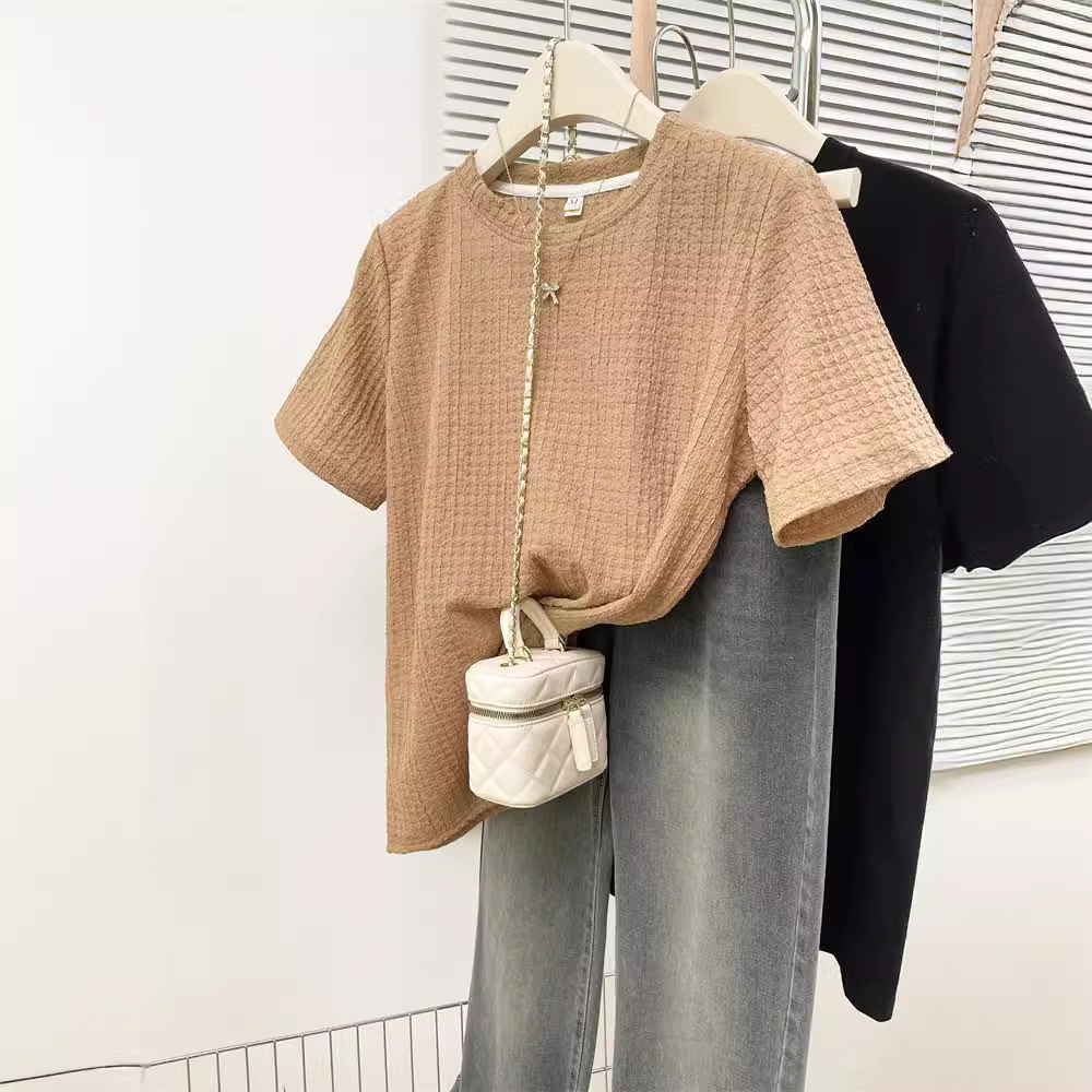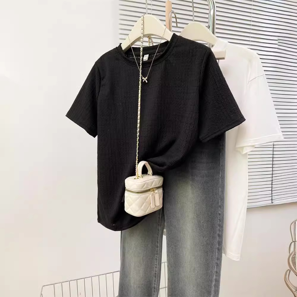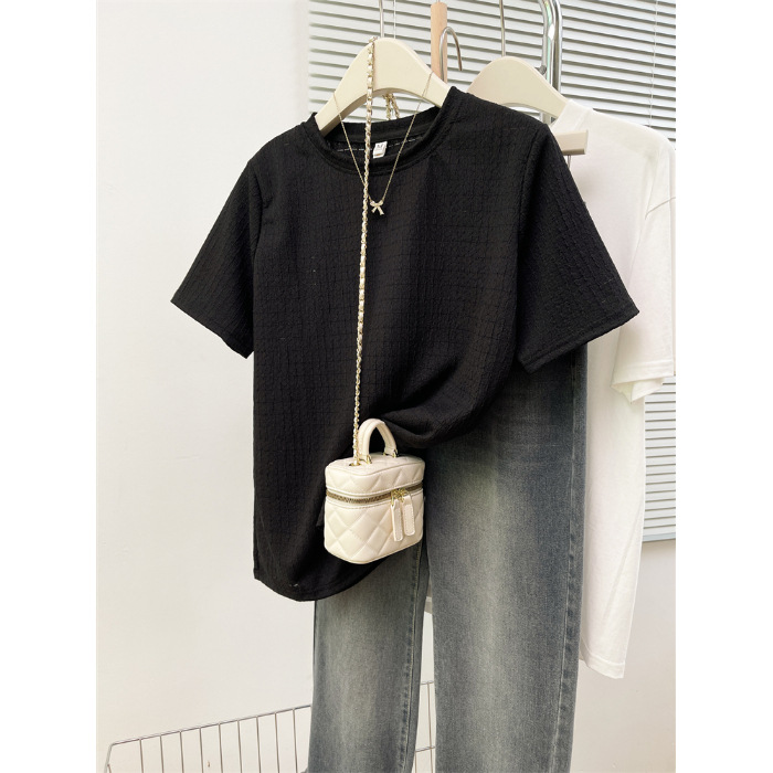 韩版新款夏季宽松百搭设计感小众个性别致提花正肩短袖T恤女