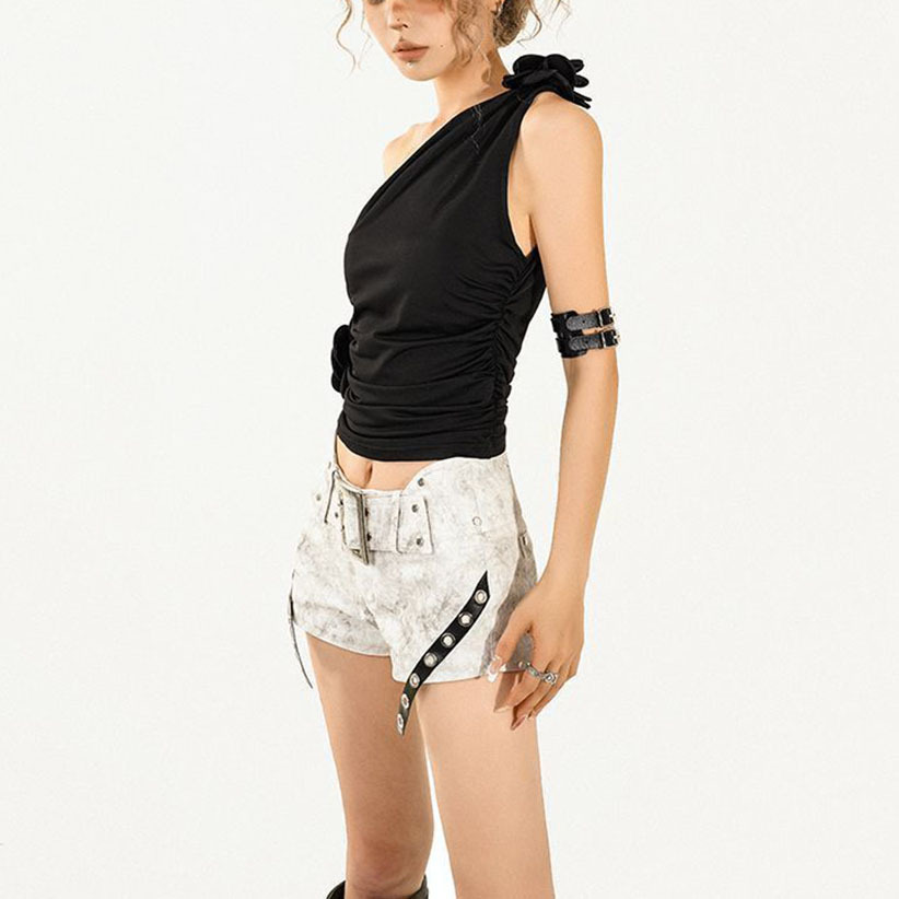 【月销10万】立体花朵黑色不规则斜肩背心女夏季设计感无袖上衣