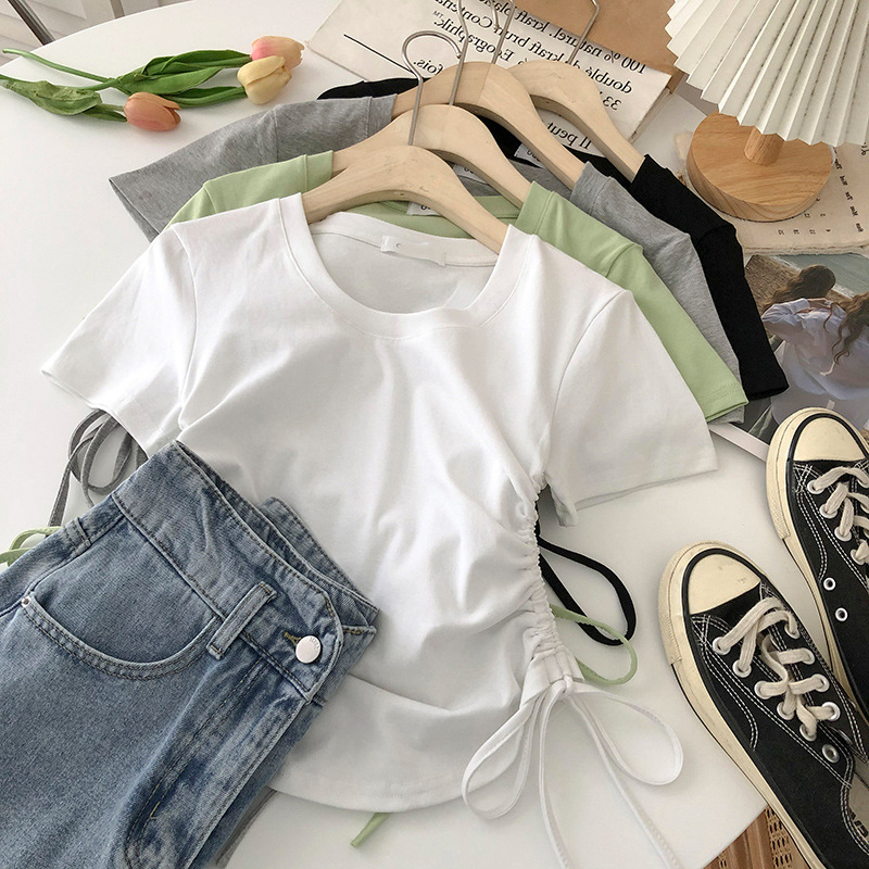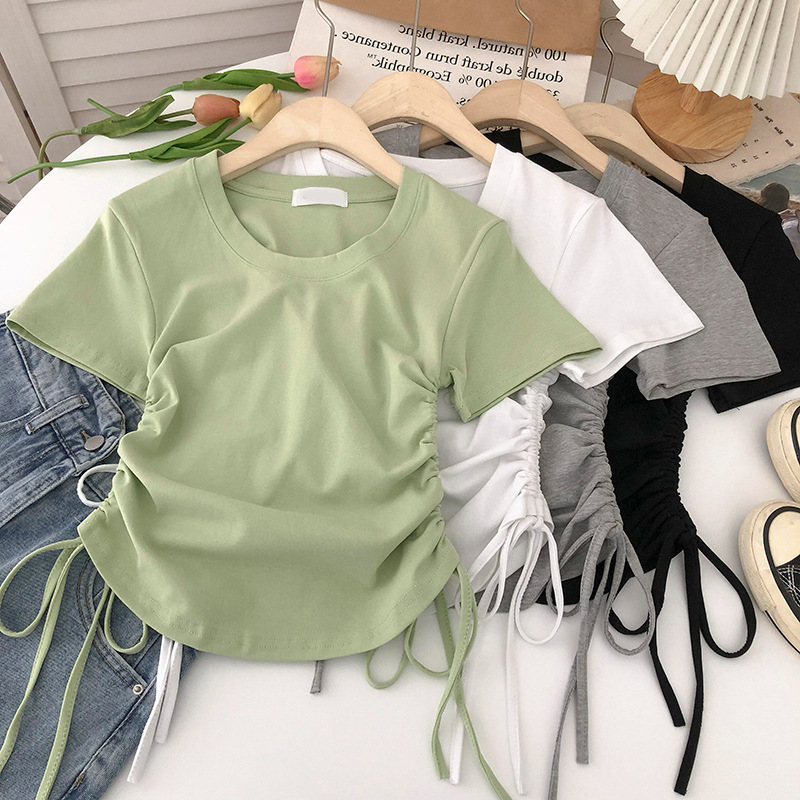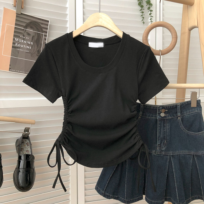 小众设计感双侧边系带褶皱短袖T恤女时尚休闲修身百搭夏季短上衣