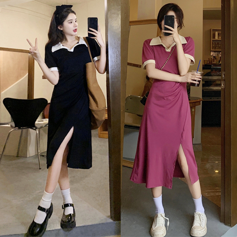 小众设计感撞色Polo领连衣裙女夏季胖MM收腰显瘦侧边开叉过膝长裙