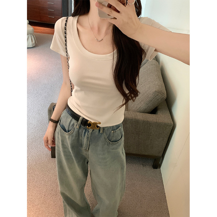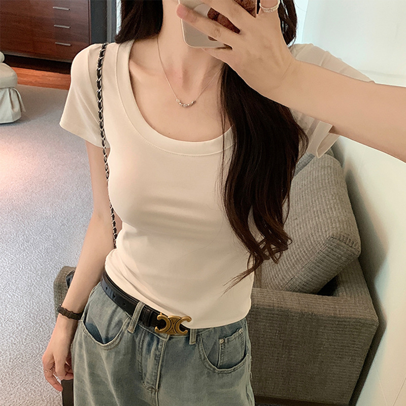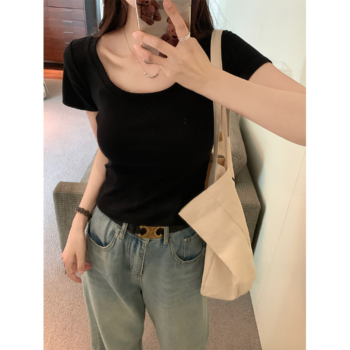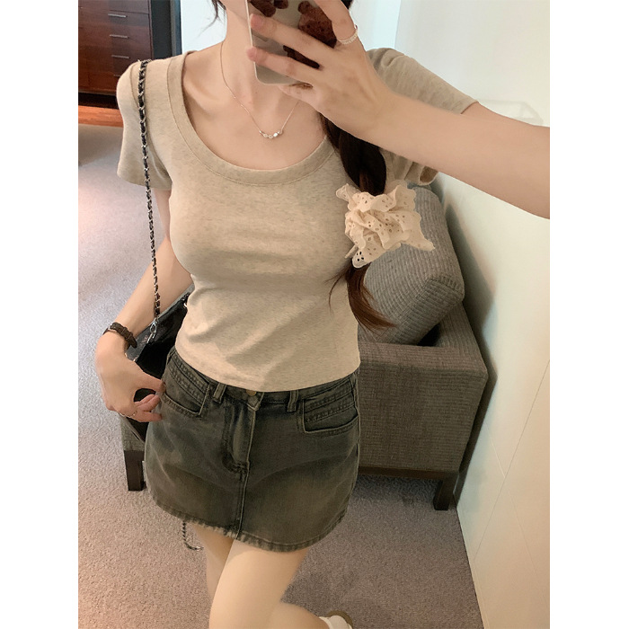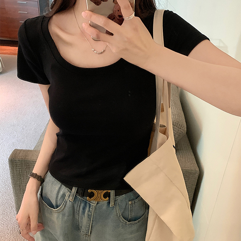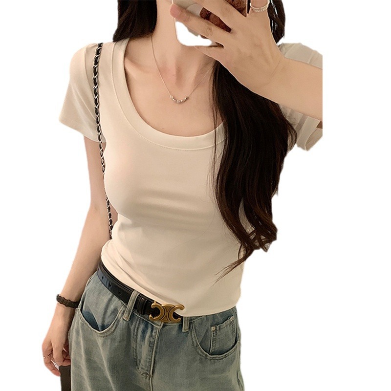 小众设计感正肩甜辣妹U领短袖T恤女夏季高腰修身显瘦百搭短款上衣