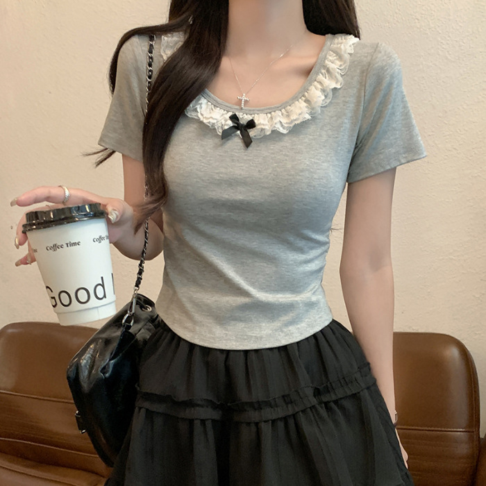 法式蕾丝花边纯欲短袖T恤女新款夏季甜辣妹修身褶皱短款上衣