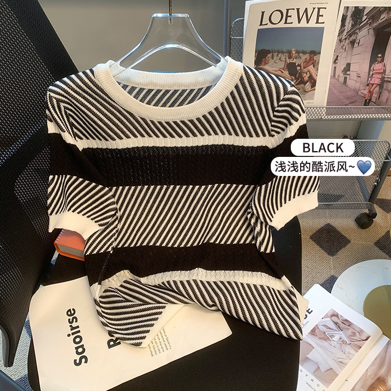 夏季新款圆领条纹短袖针织衫女韩系chic潮流高级感显瘦T恤衫