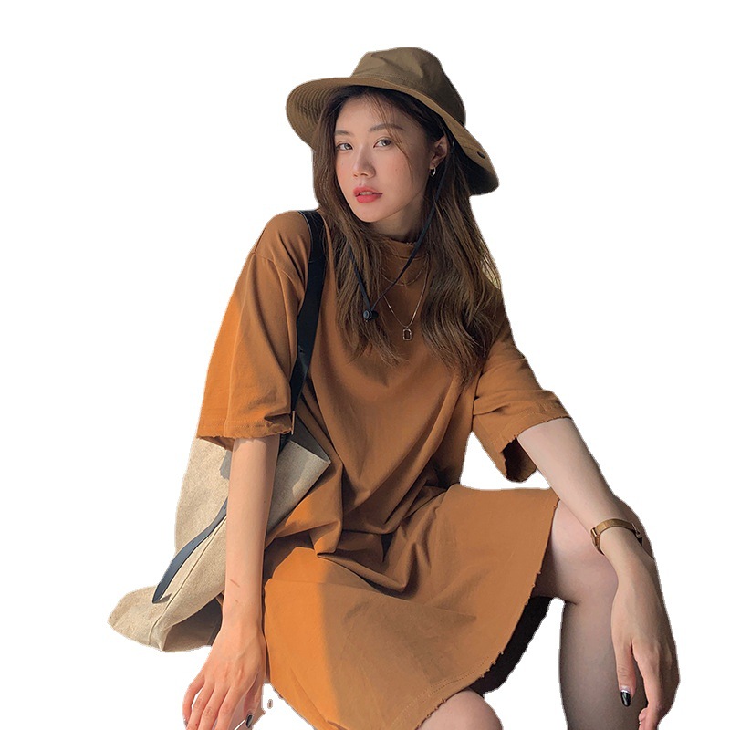 夏季新款纯棉宽松百搭中长款纯色T恤裙女胖MM遮肉显瘦连衣裙