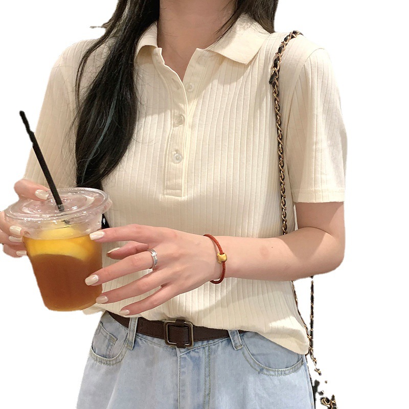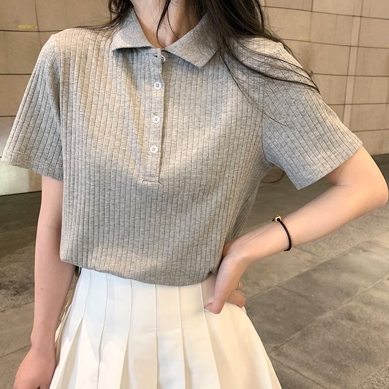 可爱学生Polo领短袖T恤女夏季修身显瘦半袖上衣小个子坑条打底衫