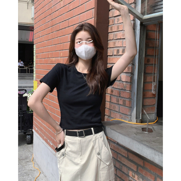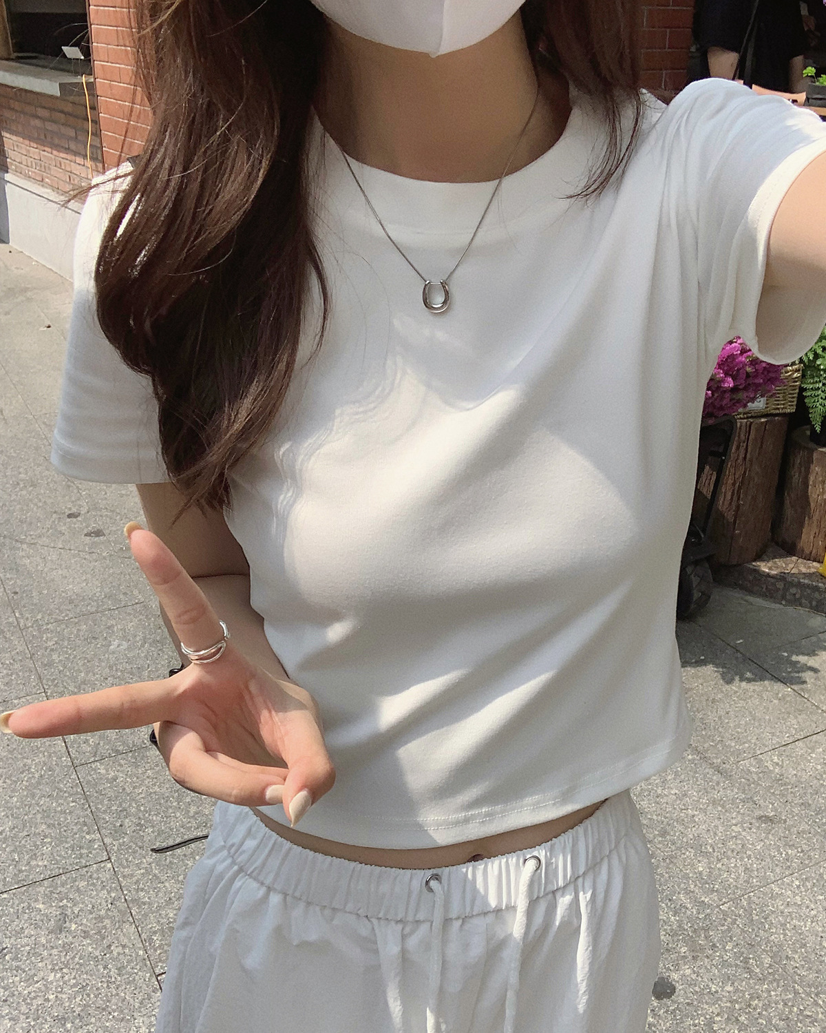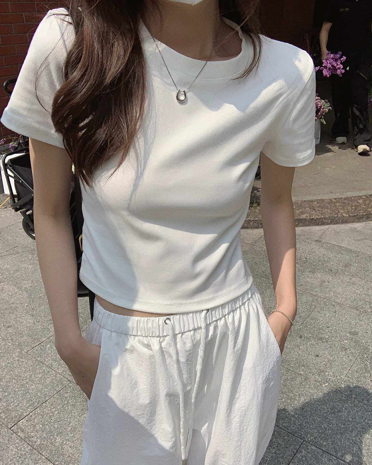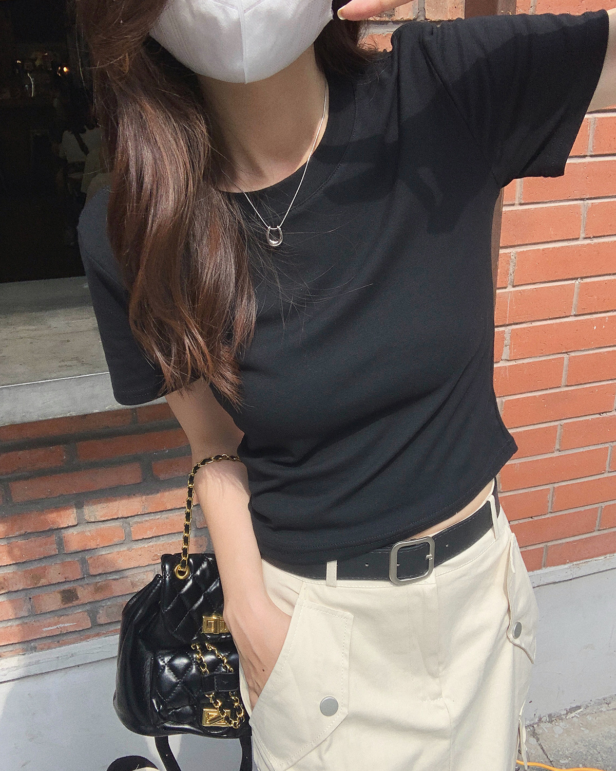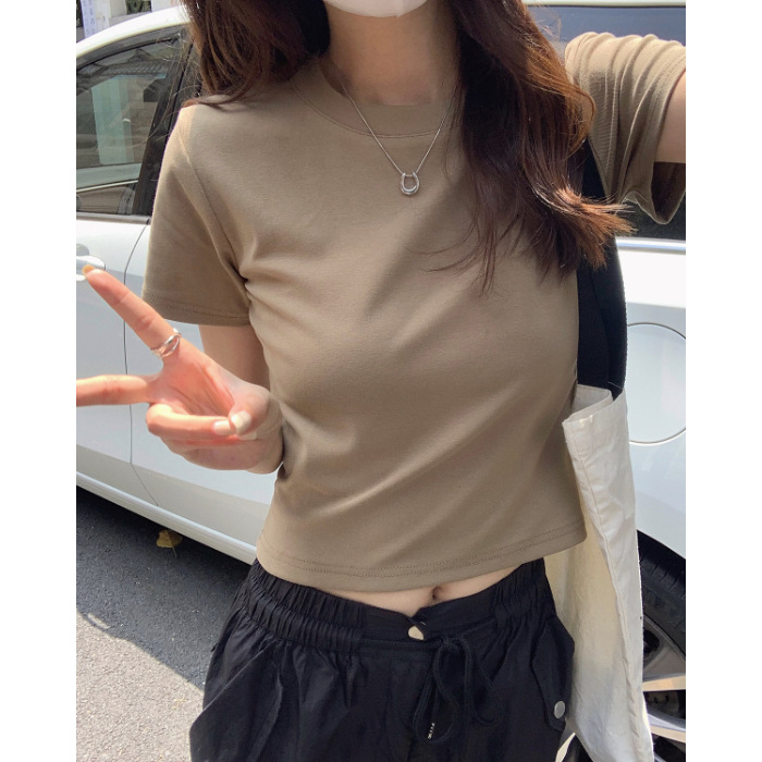 甜辣风修身露肚正肩圆领短袖T恤女夏季高腰显瘦辣妹短款百搭上衣