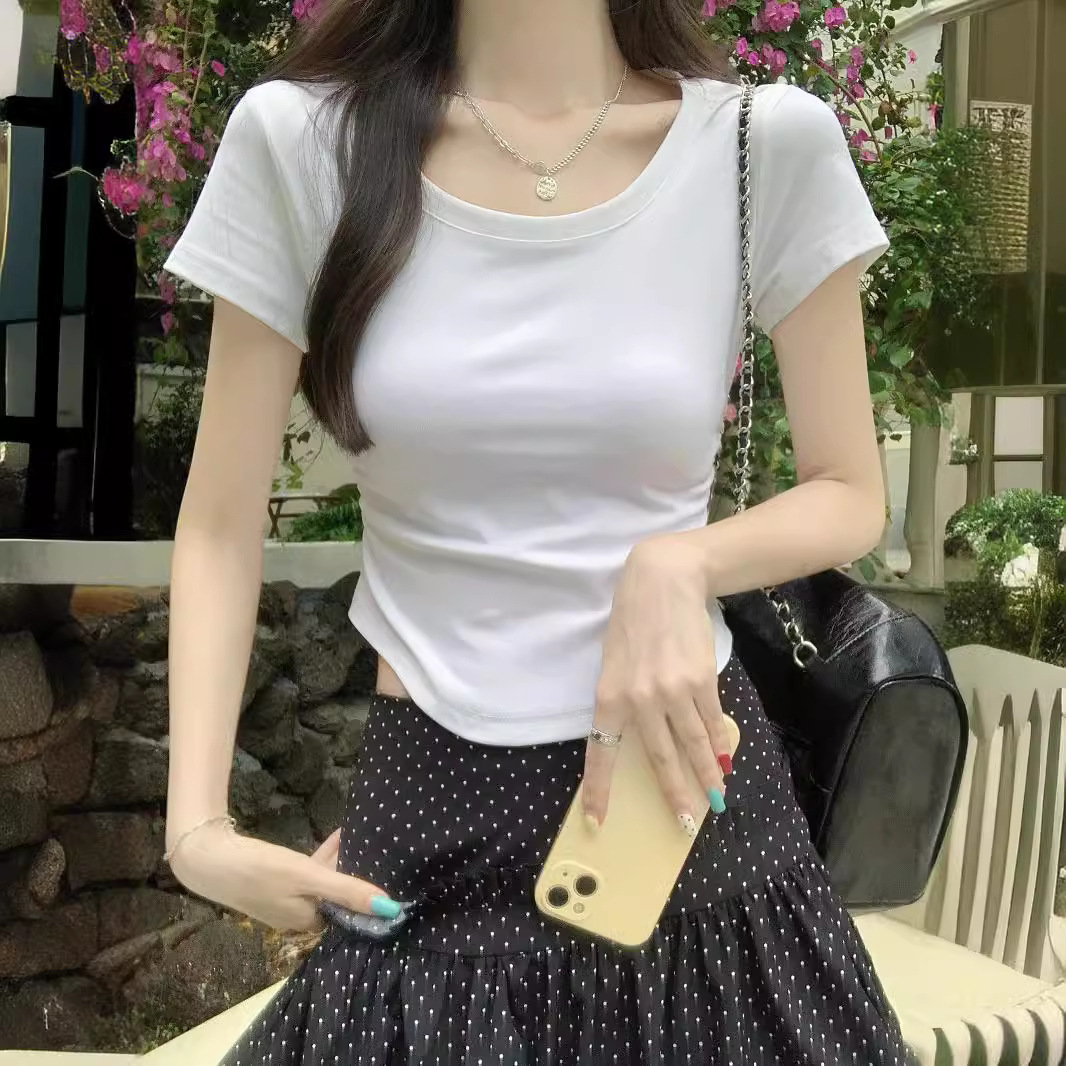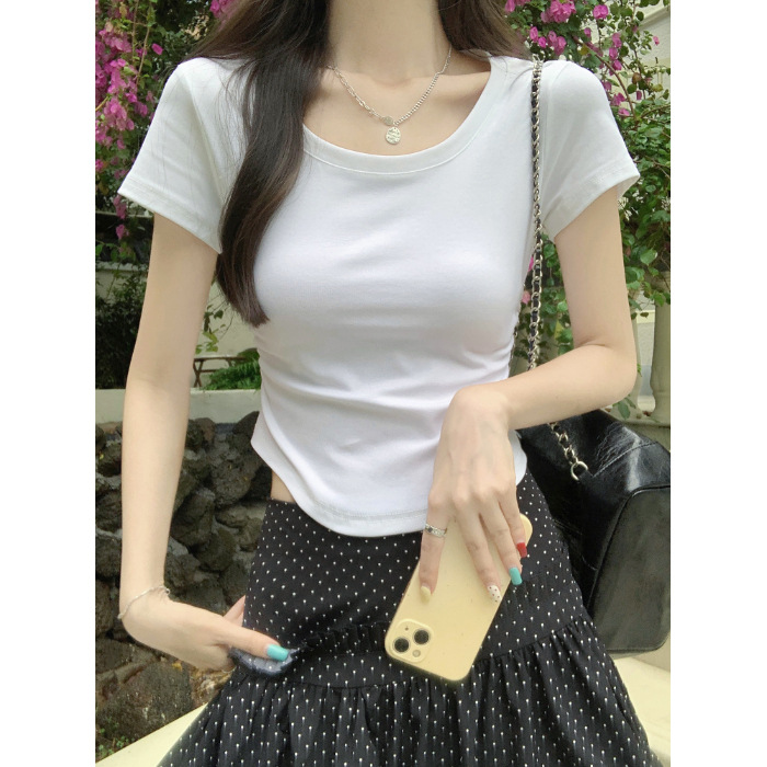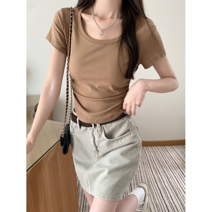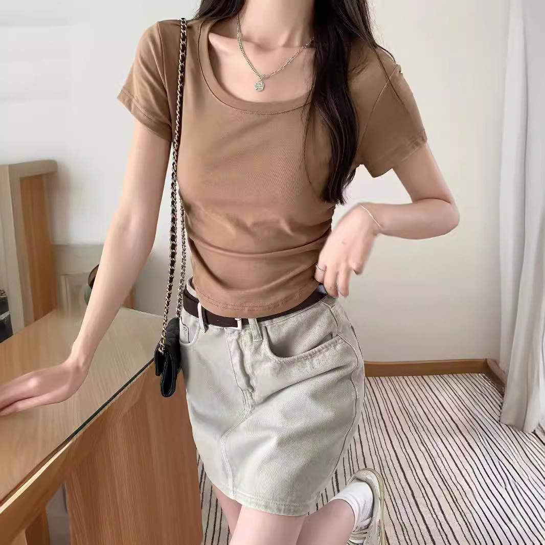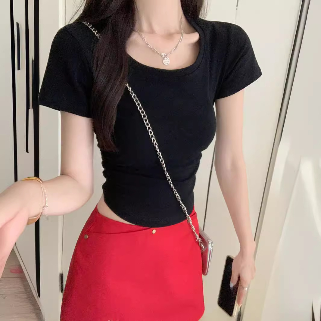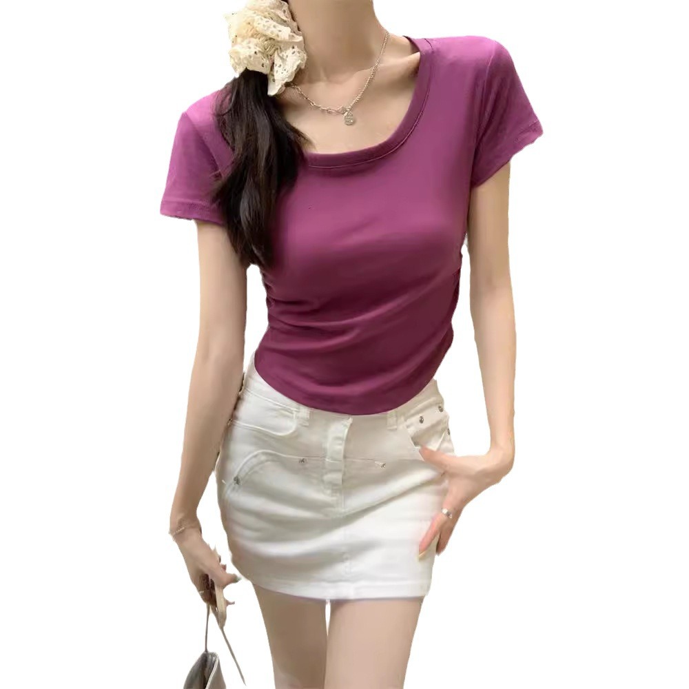 小众设计感侧边褶皱显白紫色短袖T恤女辣妹U领高腰显瘦夏季短上衣