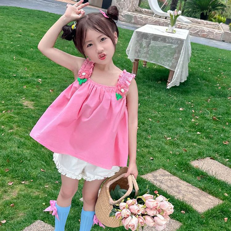 夏季女童套装宝宝洋气儿童个性潮清新韩版花朵吊带娃娃衫花边短裤