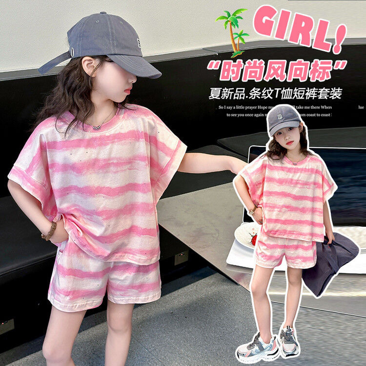 女童撒银粉条纹扎染运动套装夏装新款小女孩蝙蝠衫上衣短裤两件套