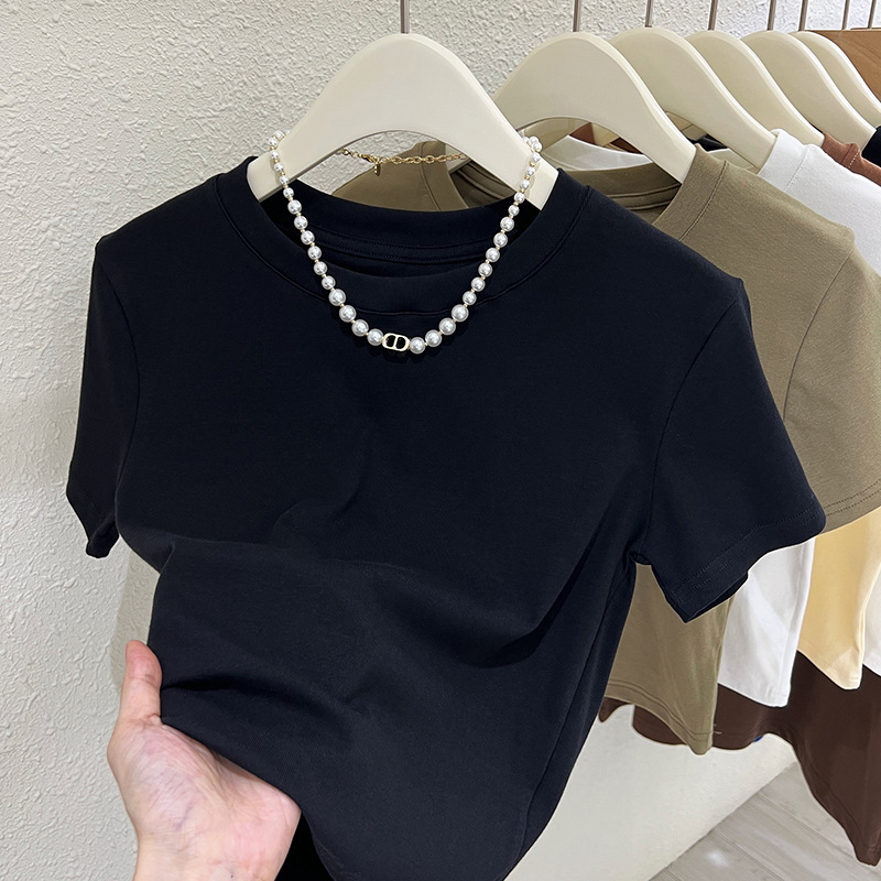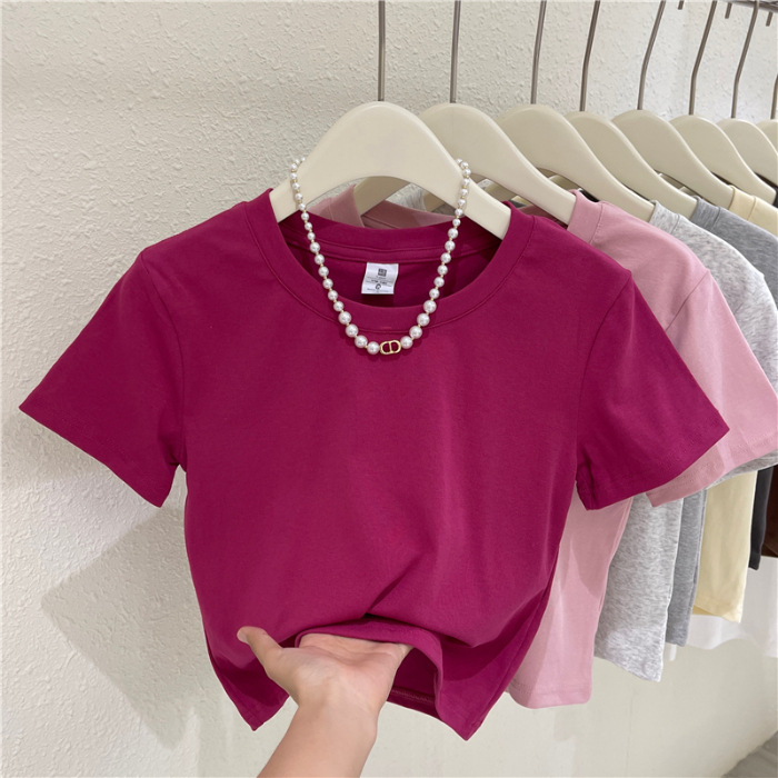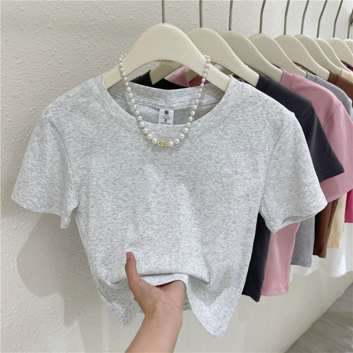 夏季小个子休闲百搭显瘦正肩圆领短袖T恤女辣妹高腰露肚短款上衣