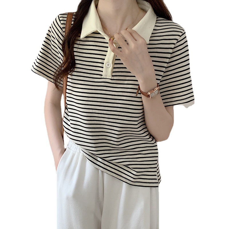 夏季新款减龄温柔甜美少女清新风POLO领宽松条纹纯棉短款T恤