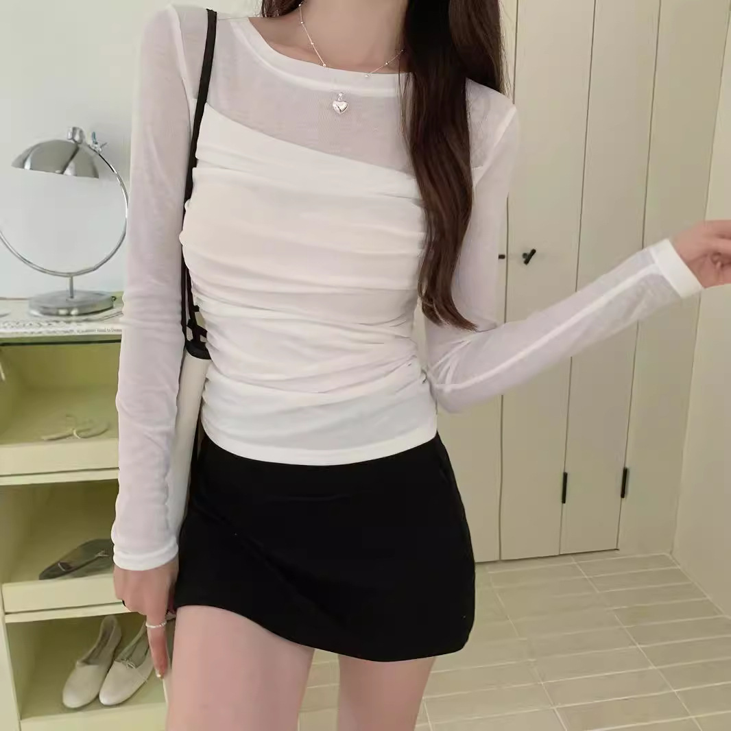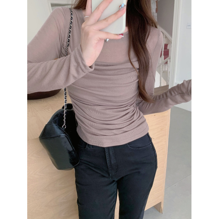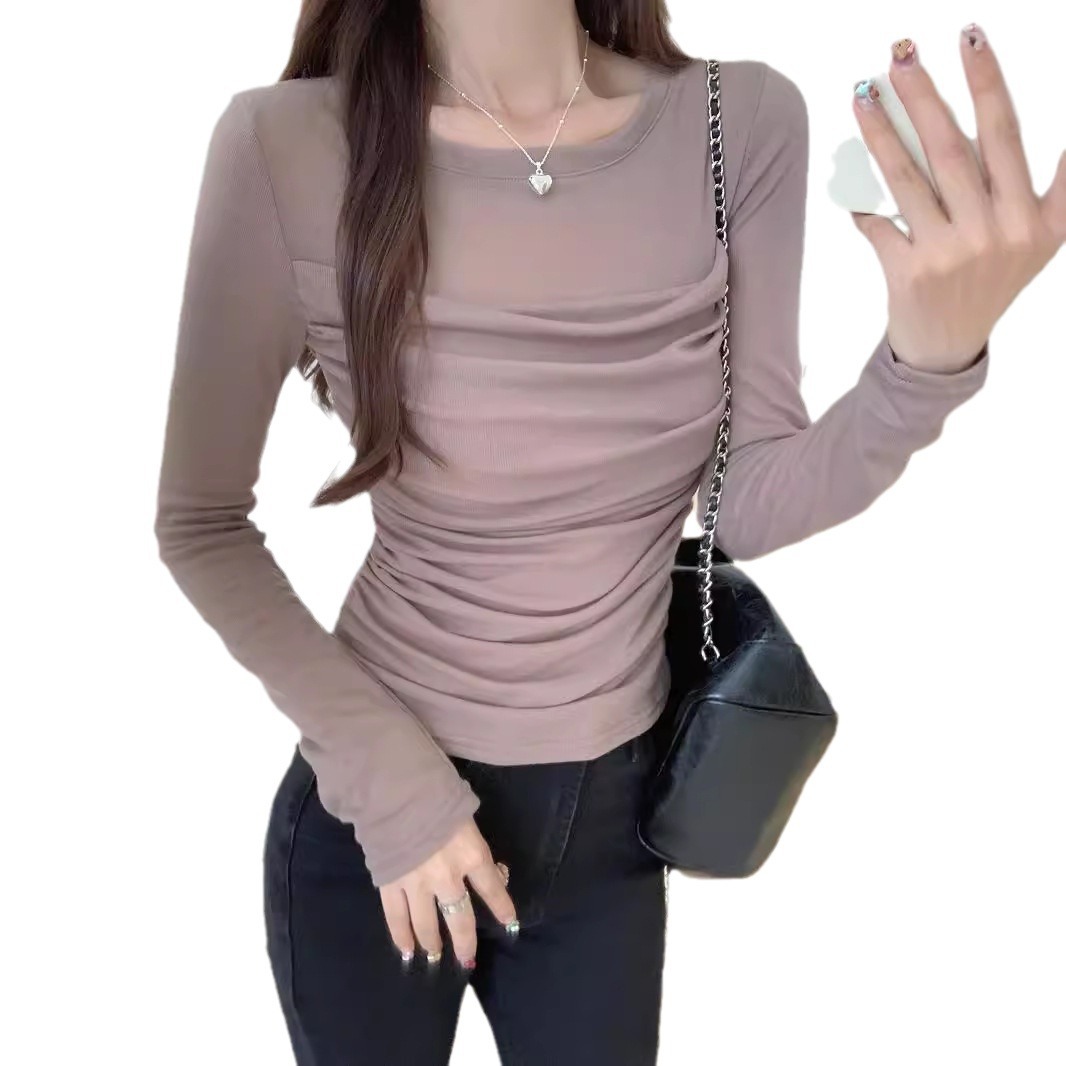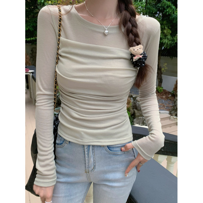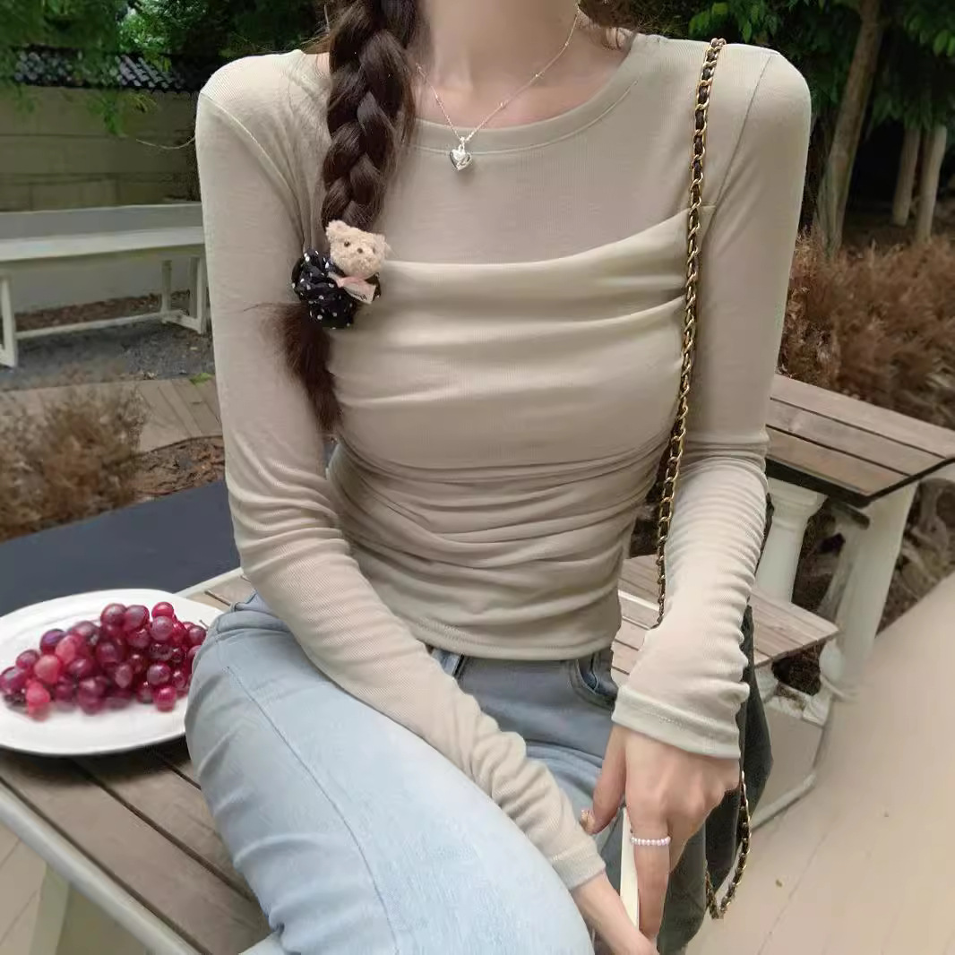 美式拼接褶皱正肩长袖t恤女春秋时尚内搭修身独特别致设计感上衣