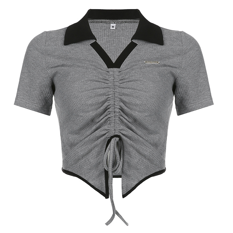 夏季新款不规则撞色翻v领抽绳褶皱短袖T恤女高级感显瘦辣妹上衣