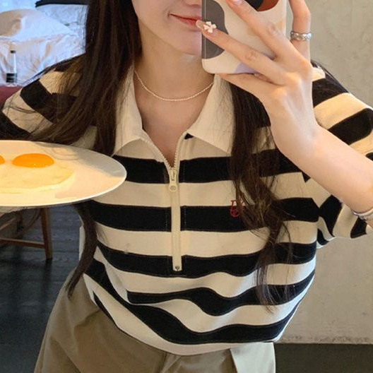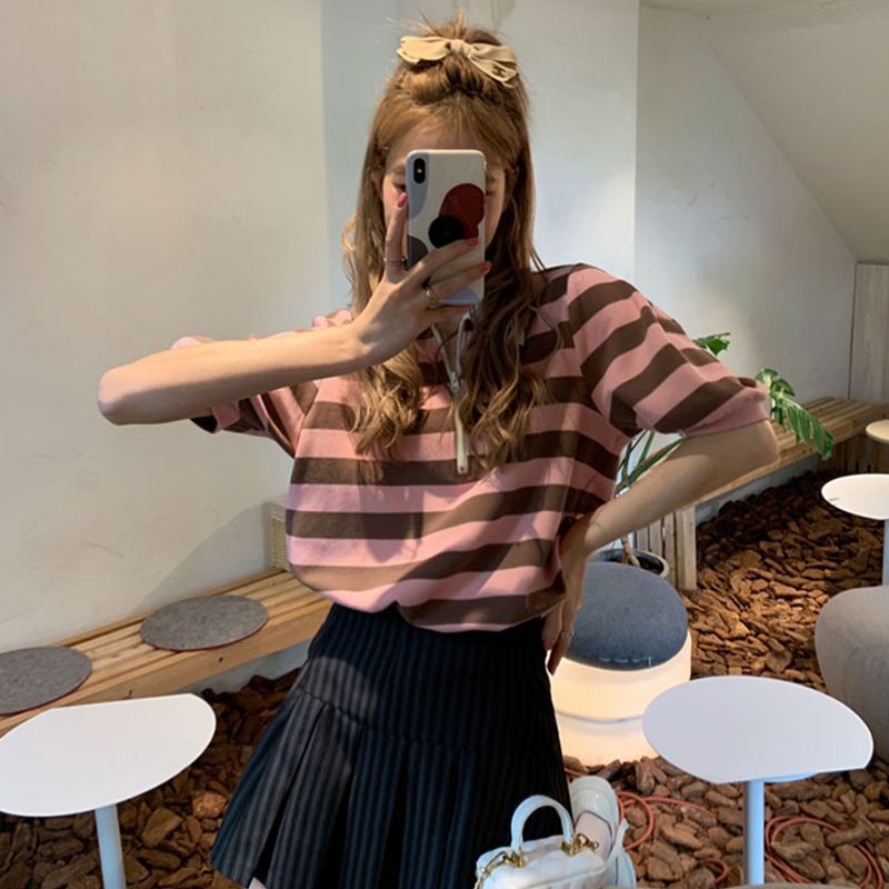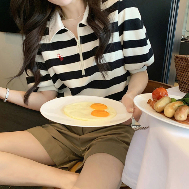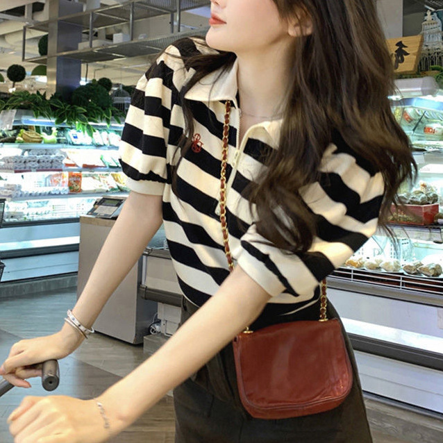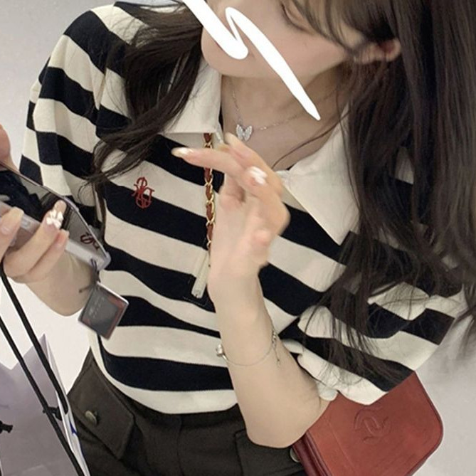 条纹翻领高级感正肩短袖T恤女夏季设计感针织宽松上衣潮