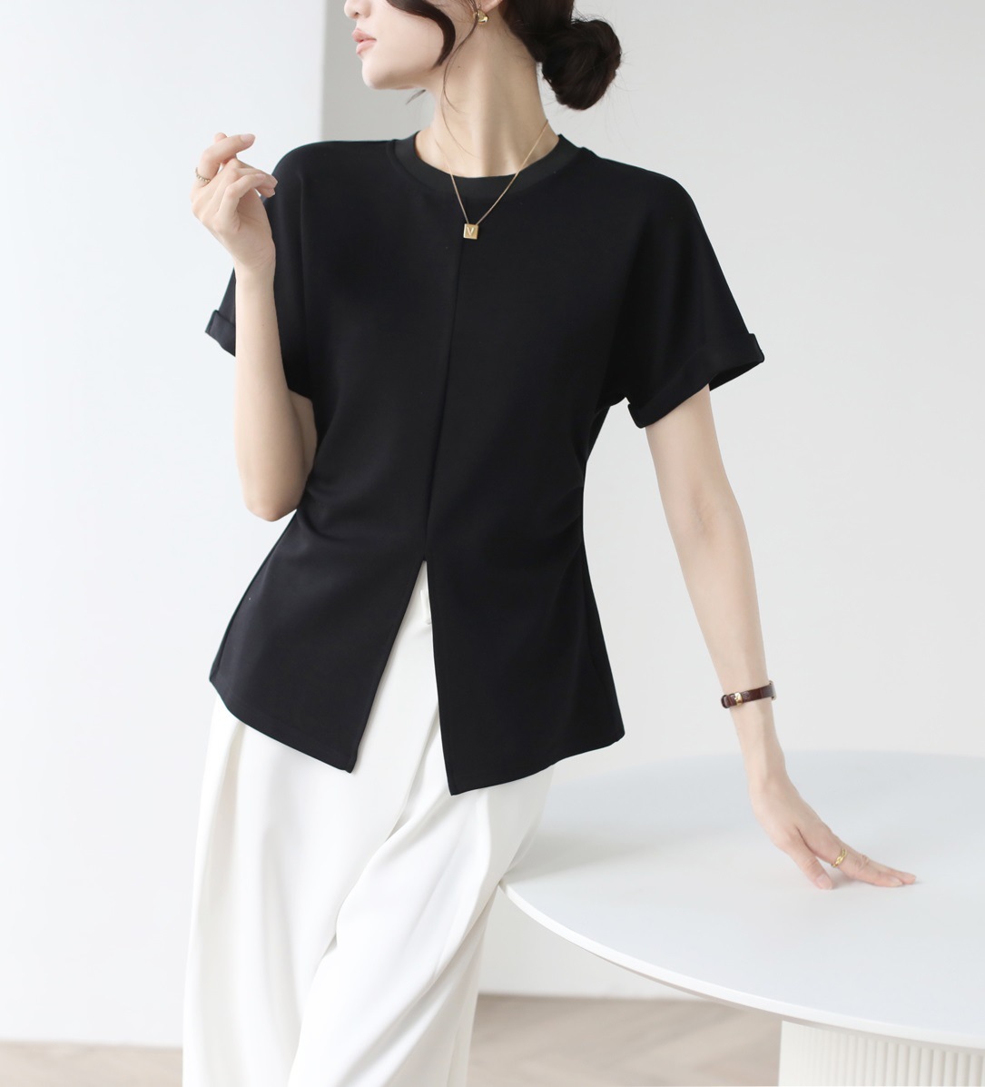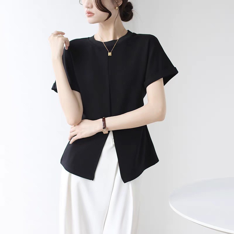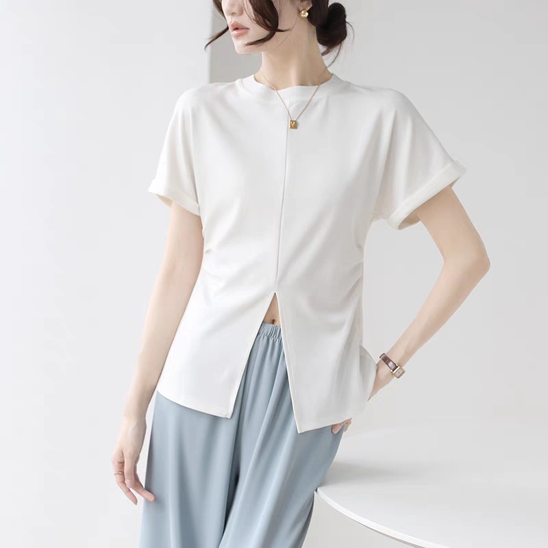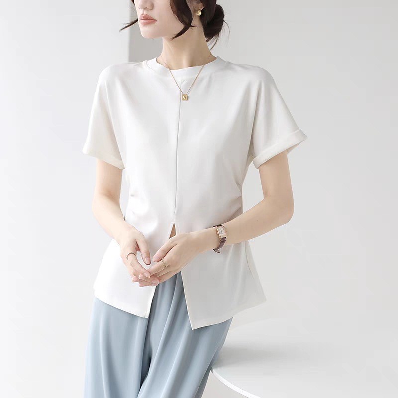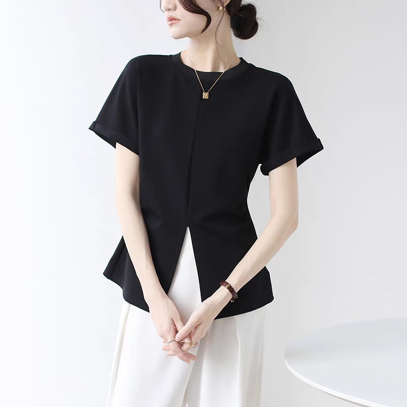 气质高级感下摆开叉短袖T恤女夏季小众设计感收腰显瘦上衣