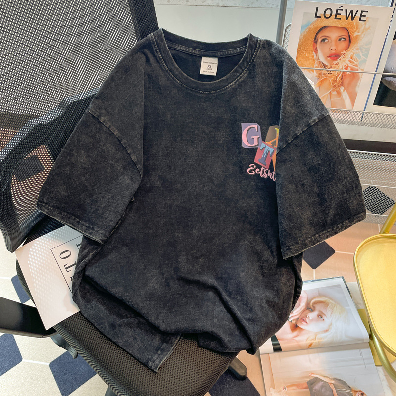新款水洗做旧纯棉t恤女夏复古灰短袖oversize宽松上衣情侣装