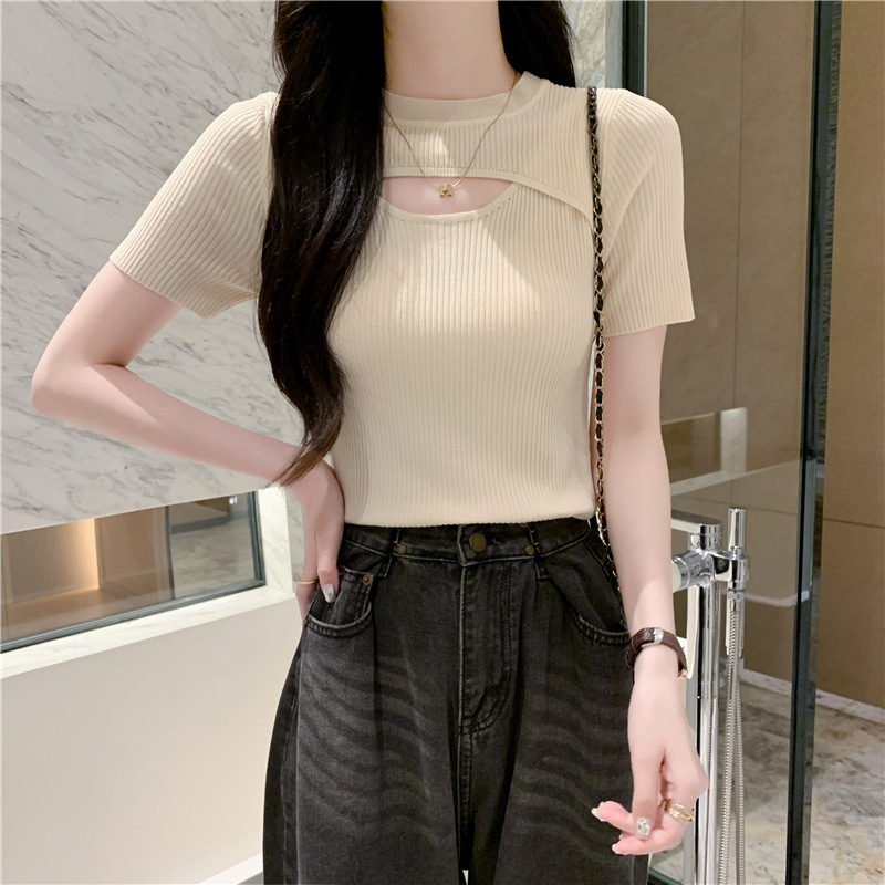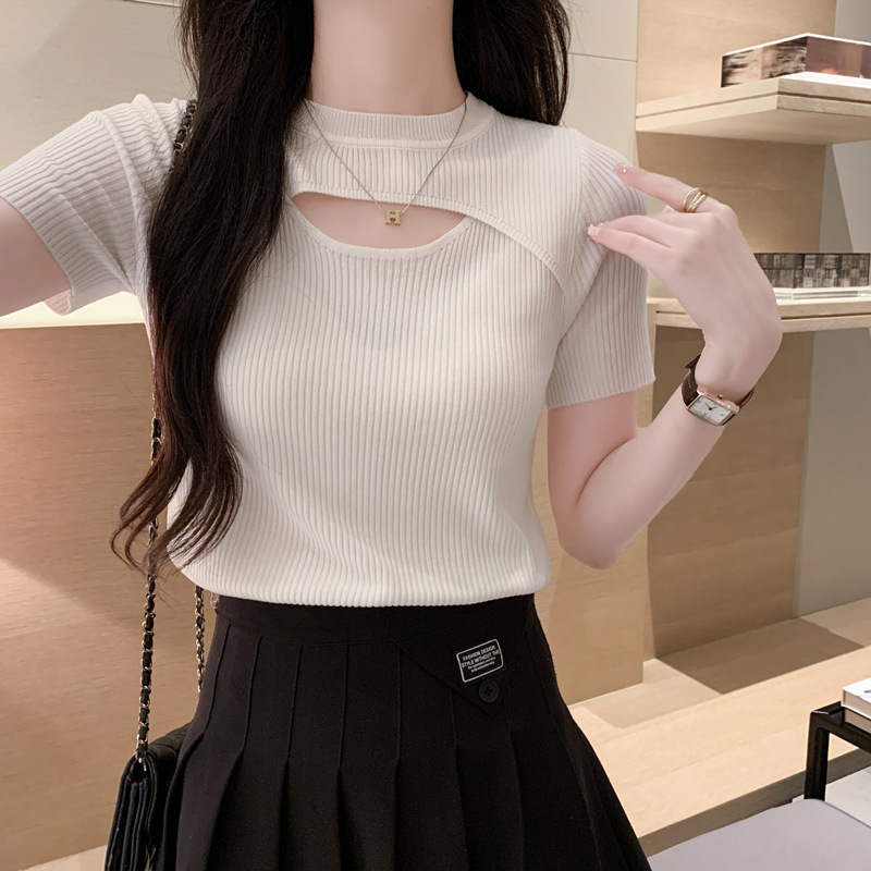 新款百搭气质镂空冰丝针织衫上衣设计感小众正肩t恤女短袖夏