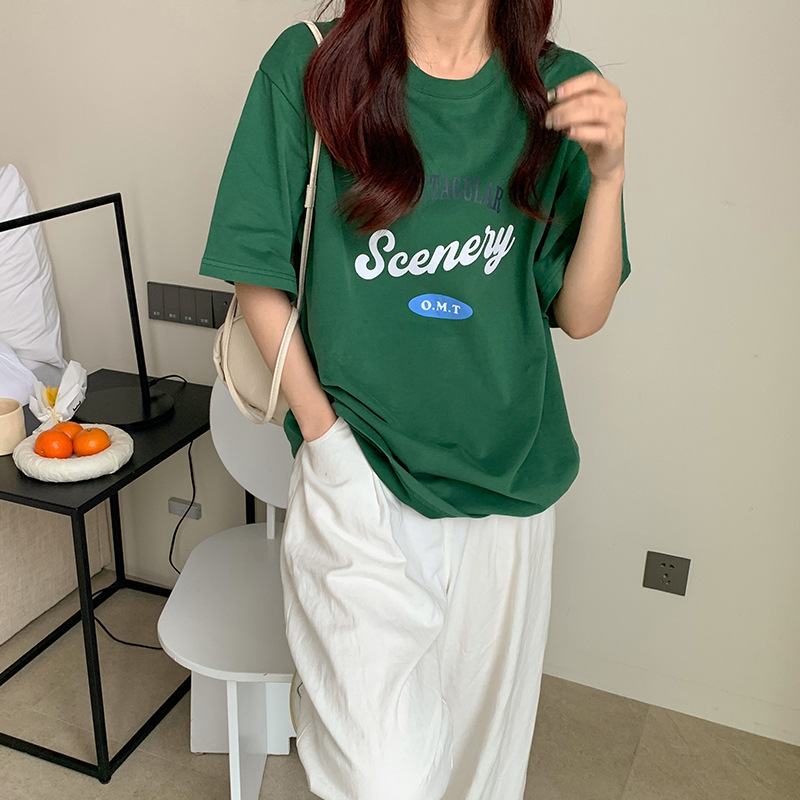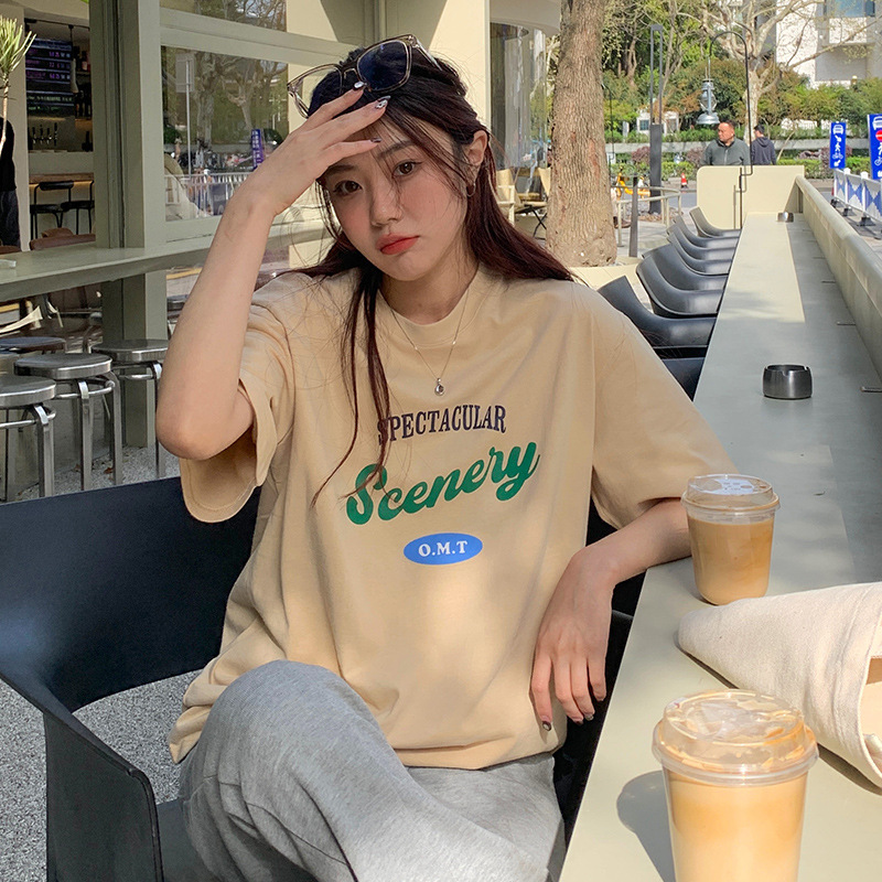 欧美纯棉连肩后包领短袖T恤美式街头撞色字母印花宽松中长款上衣