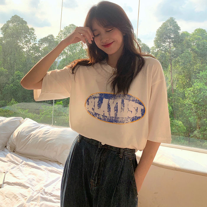 超手感莫代尔彩色音符字母印花百搭休闲小众短袖T恤半截袖上衣女
