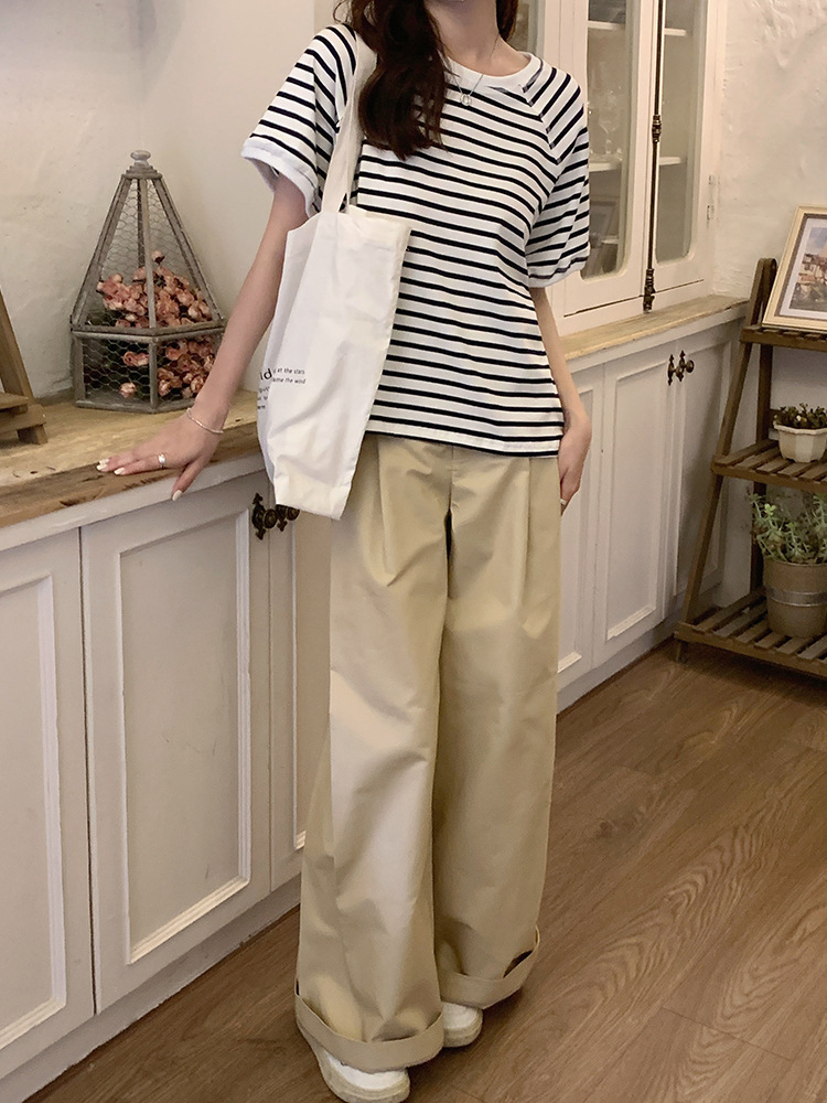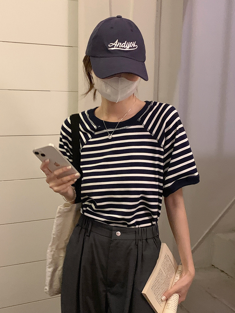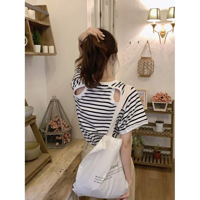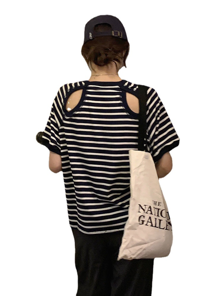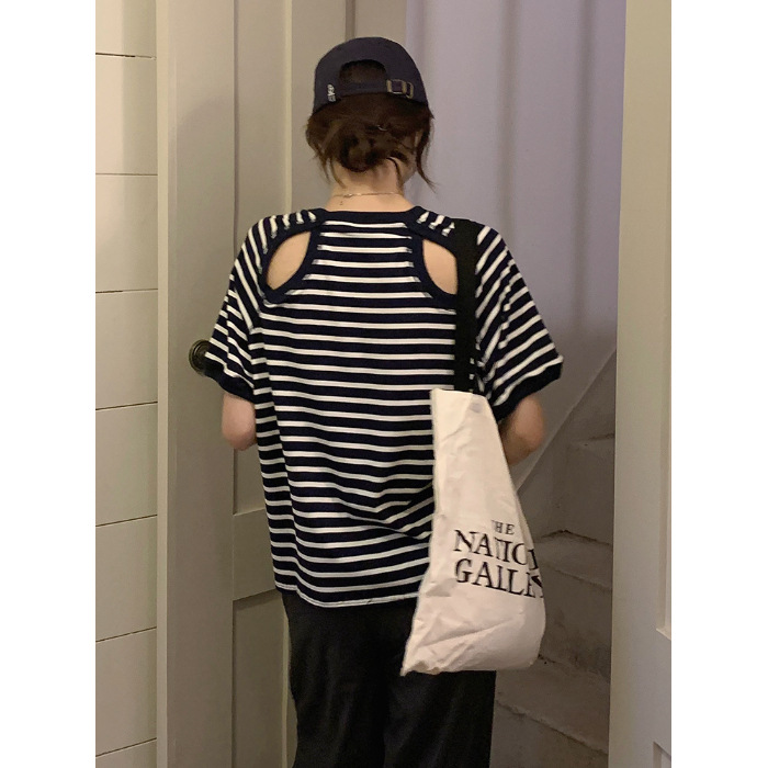 95棉港味复古条纹短袖T恤女夏季设计感小众露背宽松打底衫上衣ins