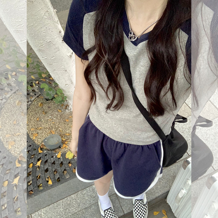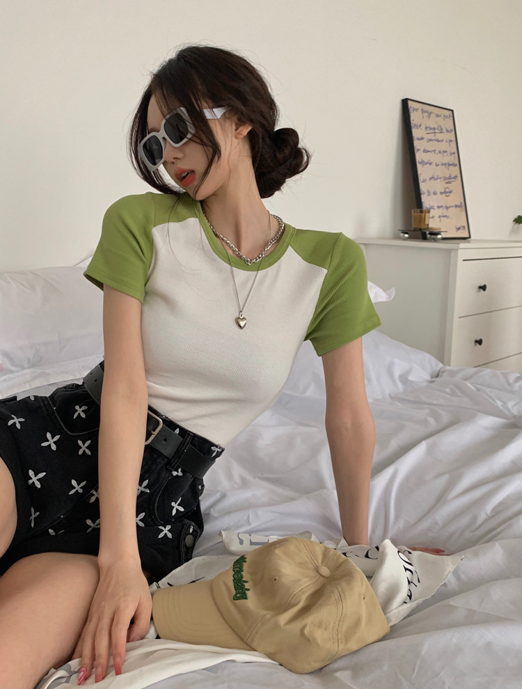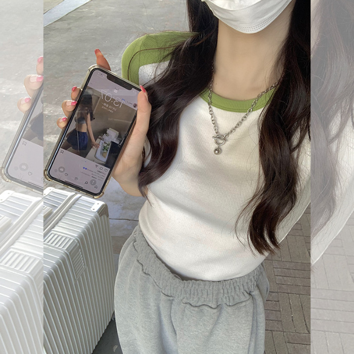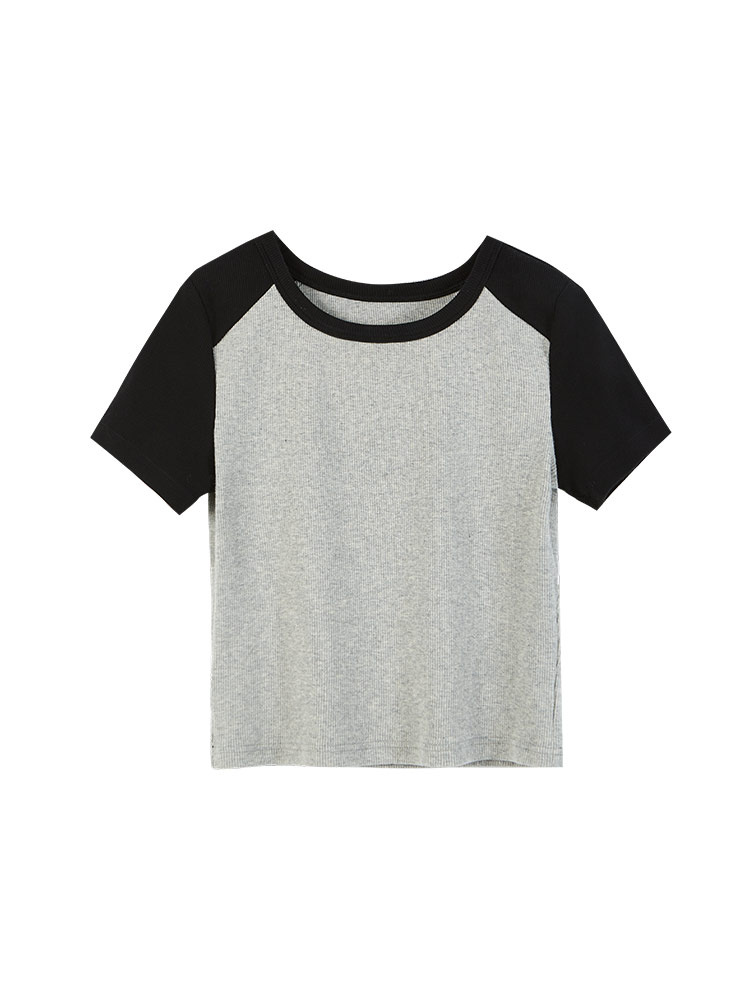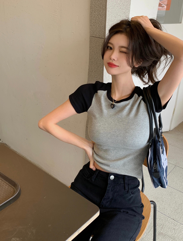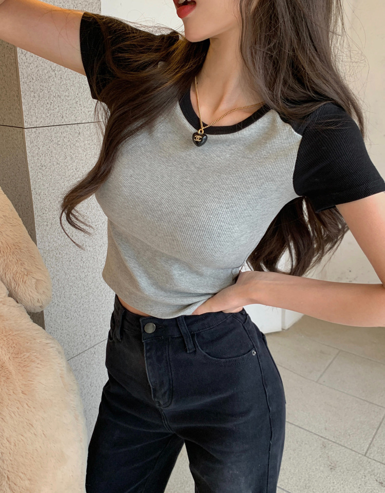 小众撞色圆领正肩短袖T恤夏季女辣妹修身百搭短款上衣春季打底衫