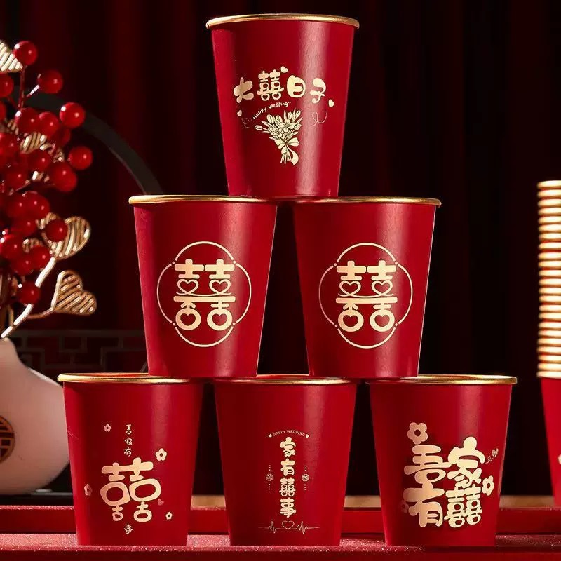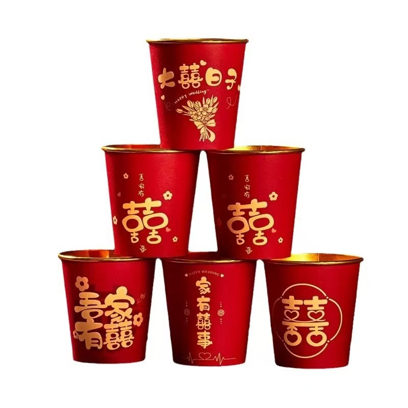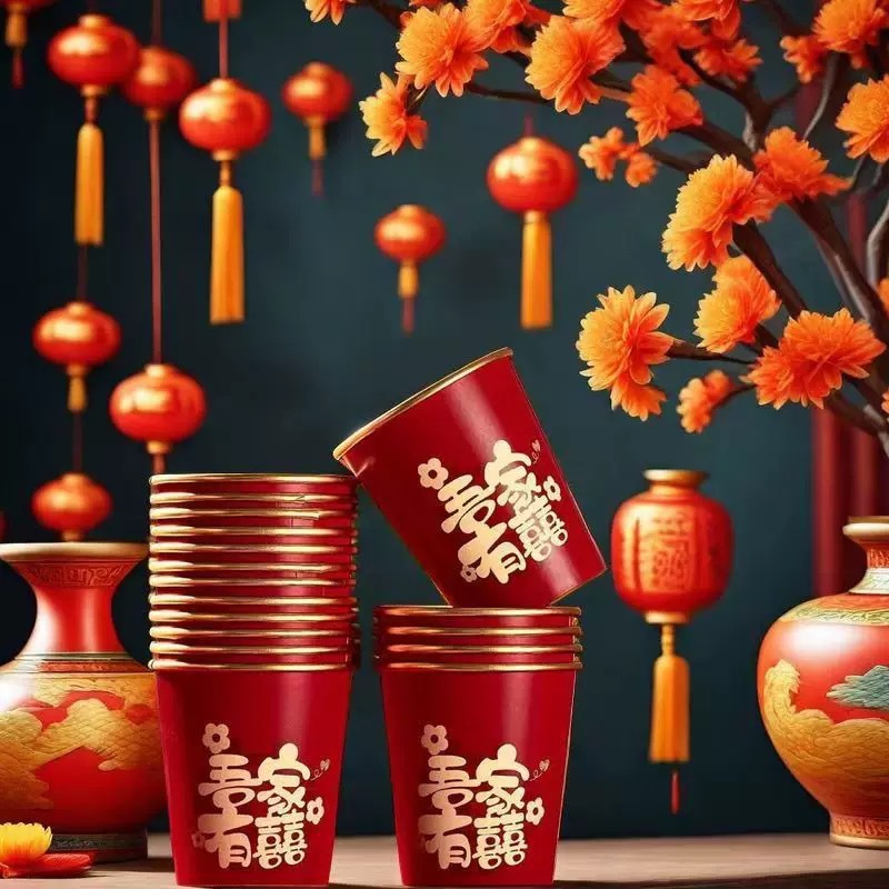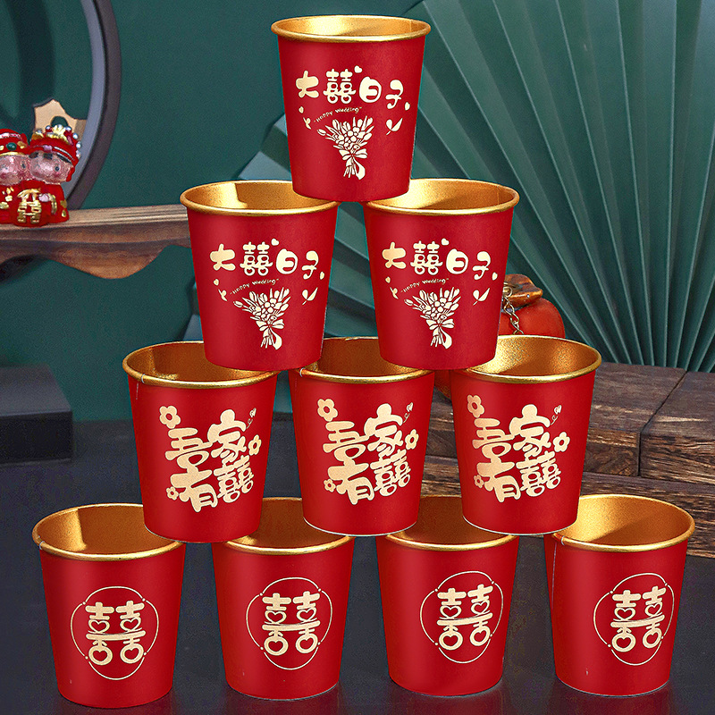 2025蛇年金箔纸杯新年一次性纸杯春节家用加厚结婚喜庆 红色纸杯子