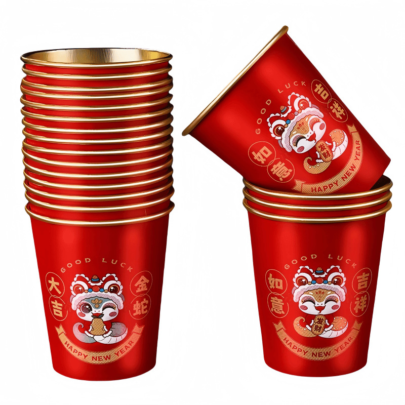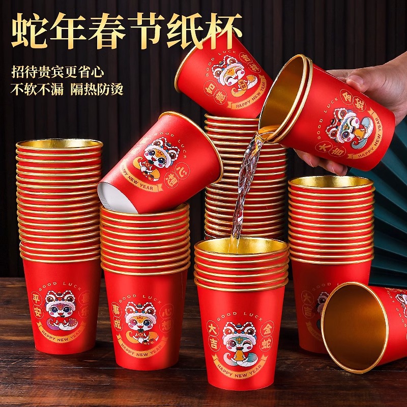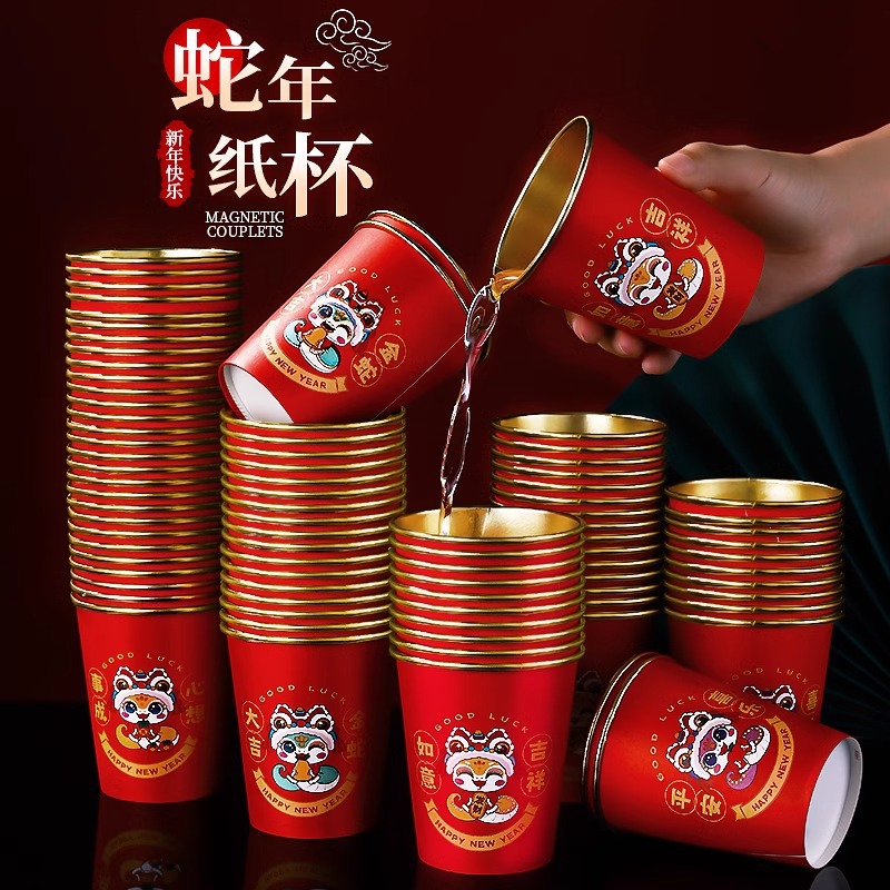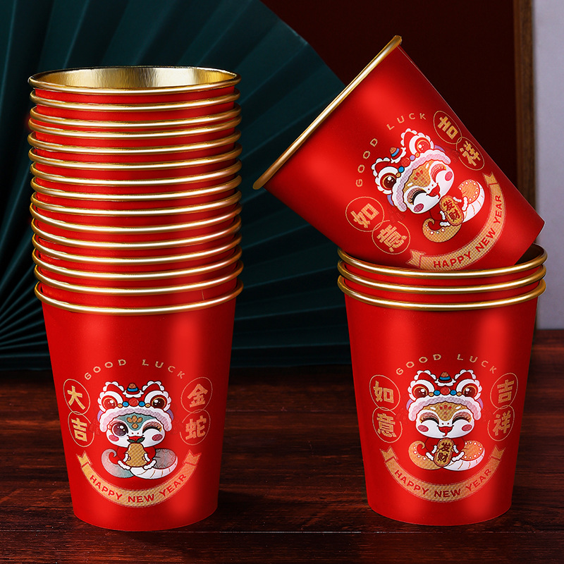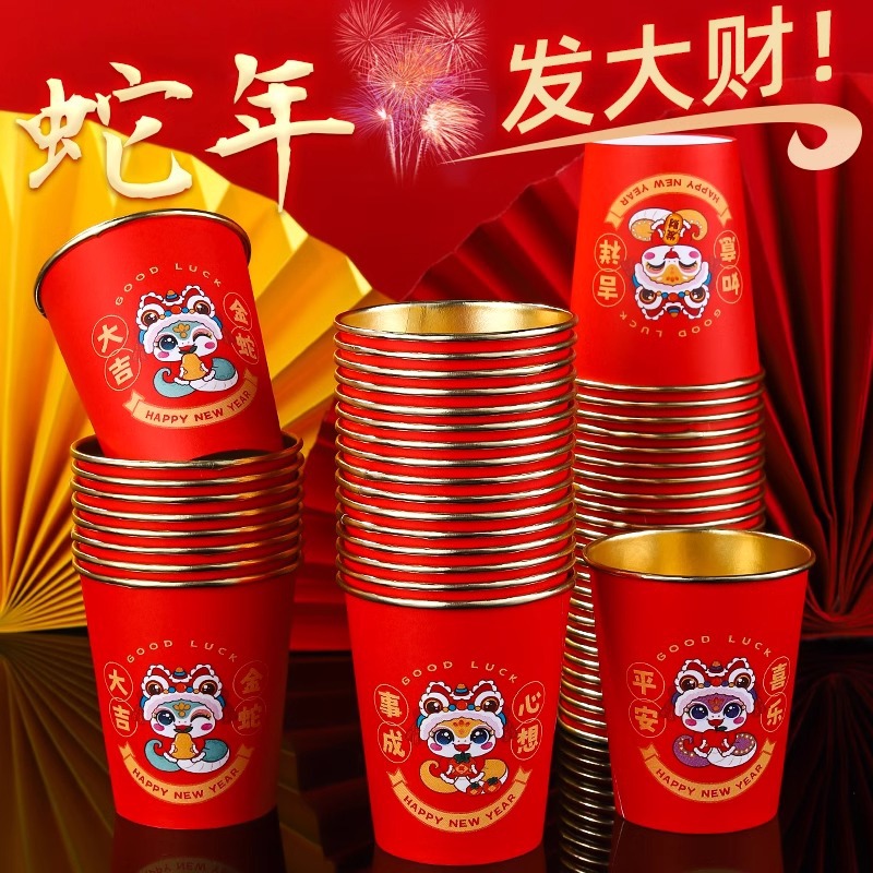 新年款一次性纸杯红色蛇年春节喜庆杯子加厚加硬金箔纸杯