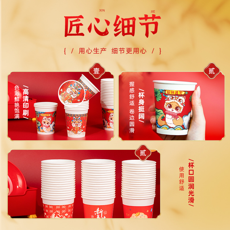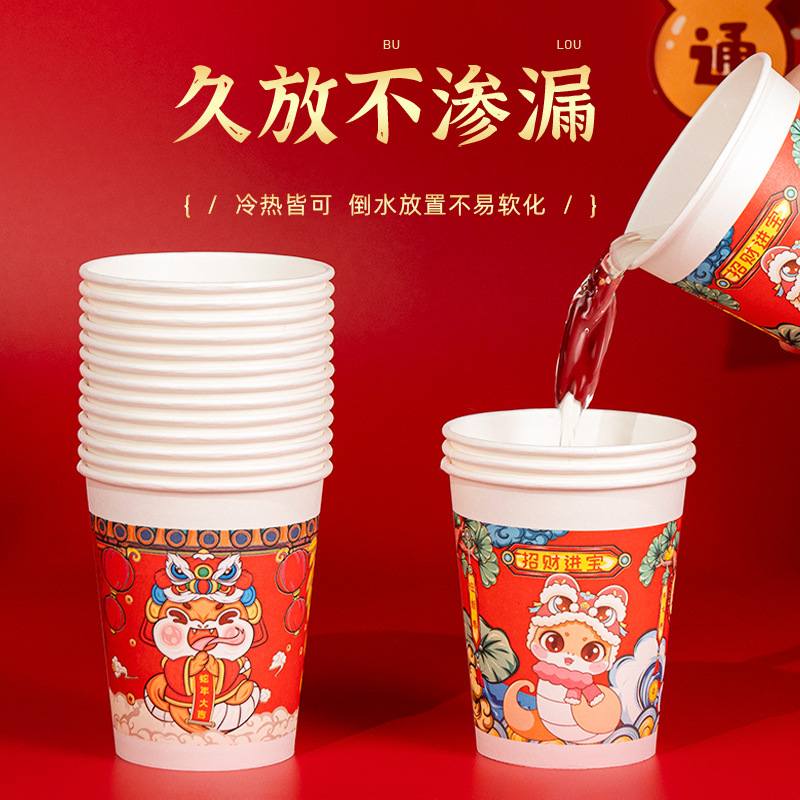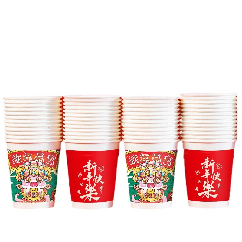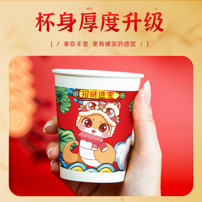 蛇年纸杯一次性杯子2025新年红色喜庆家用加厚春节年货国潮茶水杯