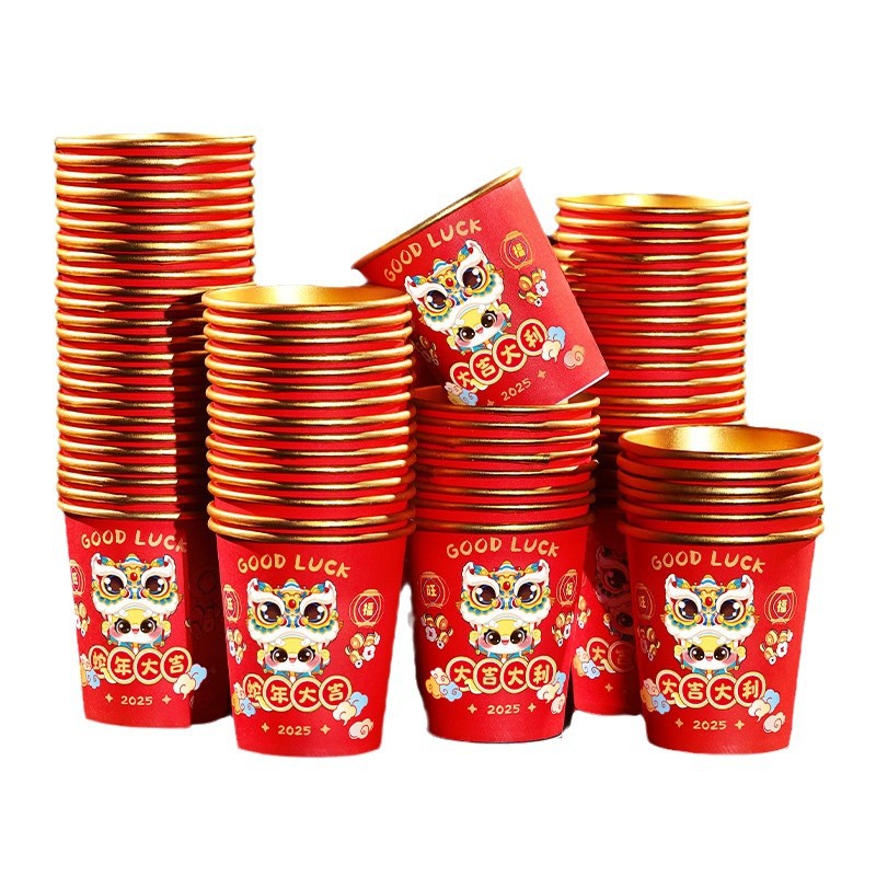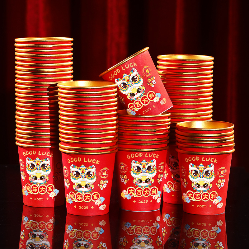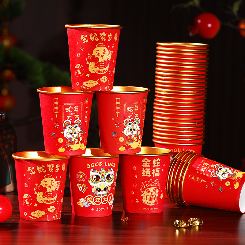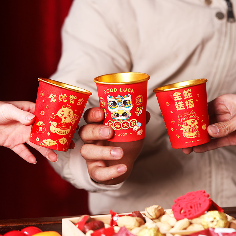2025年蛇年新年一次性纸杯过年喜庆家用杯子加厚金箔水杯春节喜杯