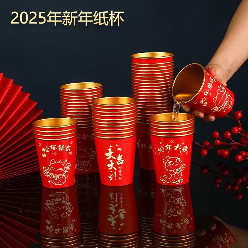 2025年新年蛇年纸杯金箔春节一次性杯子家用加厚水杯茶杯喜庆防烫