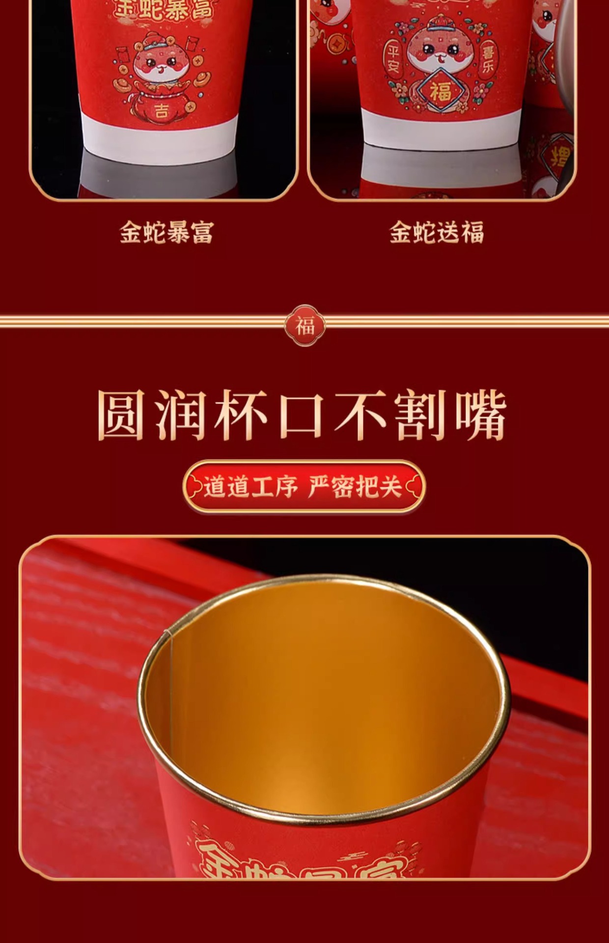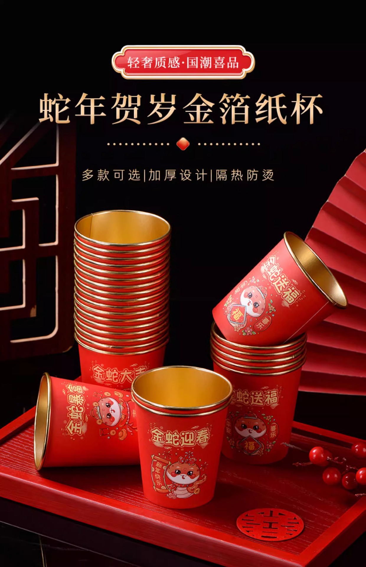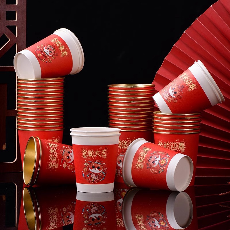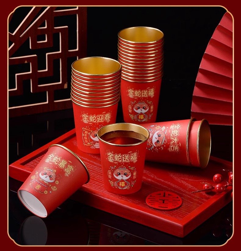 蛇年春节纸杯2025新款家用一次性杯子金箔加厚新年红杯子饮茶