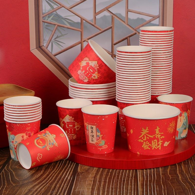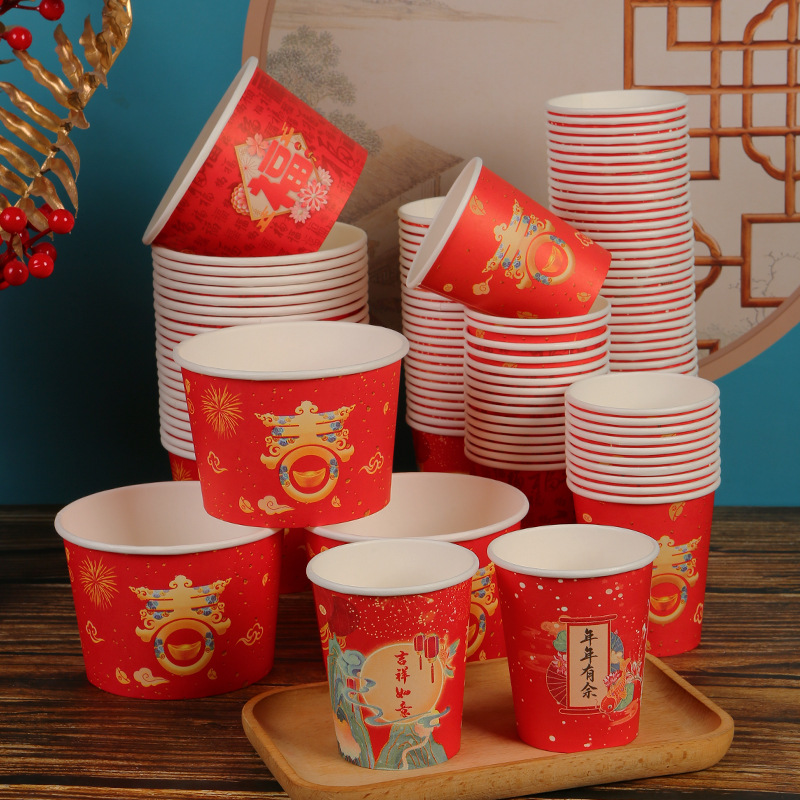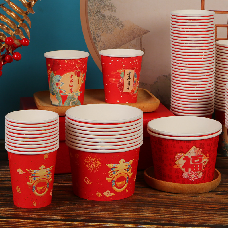 蛇年一次性纸杯2025新年纸碗加厚春节过年贺岁纸杯子福字聚餐纸碗