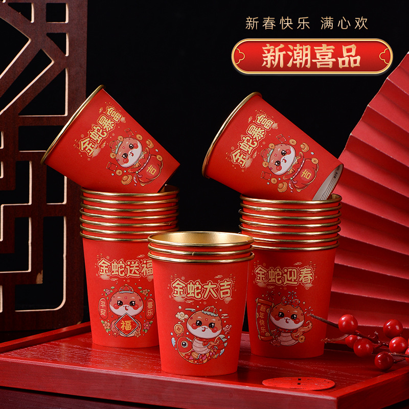 2025蛇年纸杯新年过年一次性金箔纸杯子春节家用福字结婚喜庆水杯