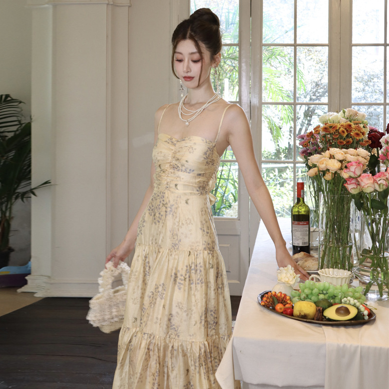法式度假风长裙风情万种的黄色碎花吊带连衣裙夏季修身显瘦仙女裙